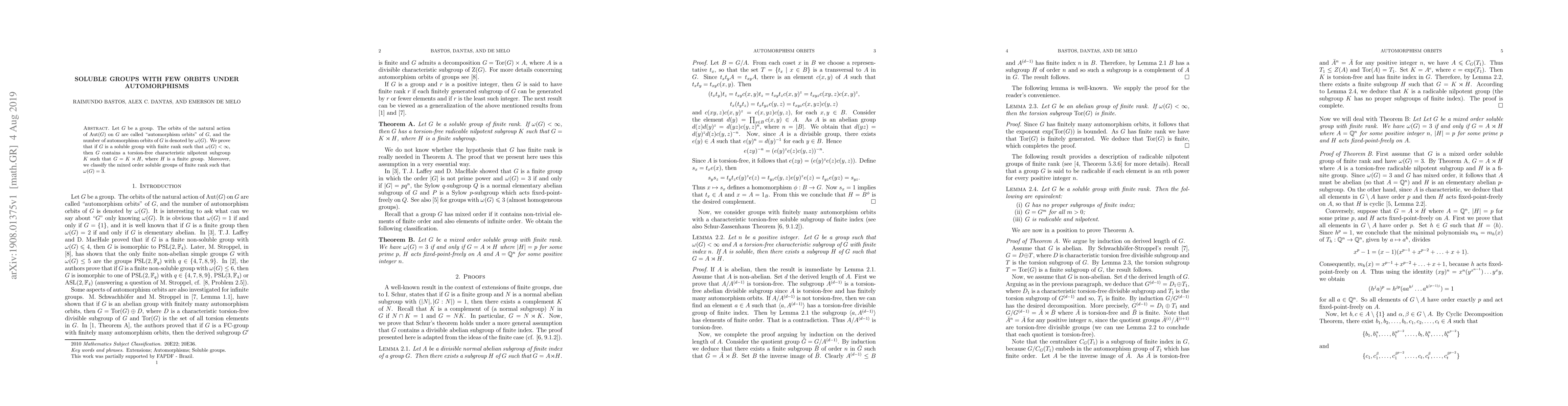 Let $G$ be a group. The orbits of the natural action of Aut$(G)$ on $G$ are called ``automorphism orbits'' of $G$, and the number of automorphism orbits of $G$ is denoted by $\omega(G)$. We prove that if $G$ is a soluble group with finite rank such that $\omega(G)< \infty$, then $G$ contains a torsion-free characteristic nilpotent subgroup $K$ such that $G = K \rtimes H$, where $H$ is a finite group. Moreover, we classify the mixed order soluble groups of finite rank such that $\omega(G)=3$.