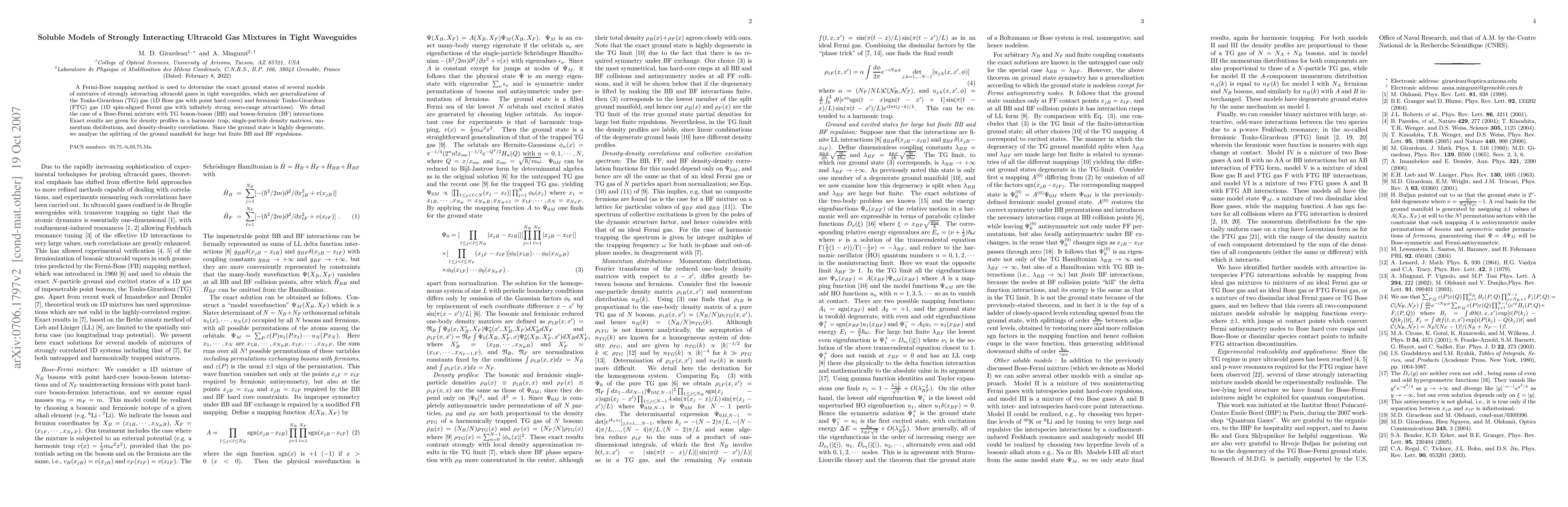 This paper uses a generalized Fermi-Bose mapping method to determine exact ground states for ultracold gas mixtures in tight waveguides, focusing on Bose-Fermi mixtures with Tonks-Girardeau interactions. The study provides detailed results on density profiles, single-particle matrices, momentum distributions, and correlations, analyzing the splitting of the degenerate ground state under strong interactions.