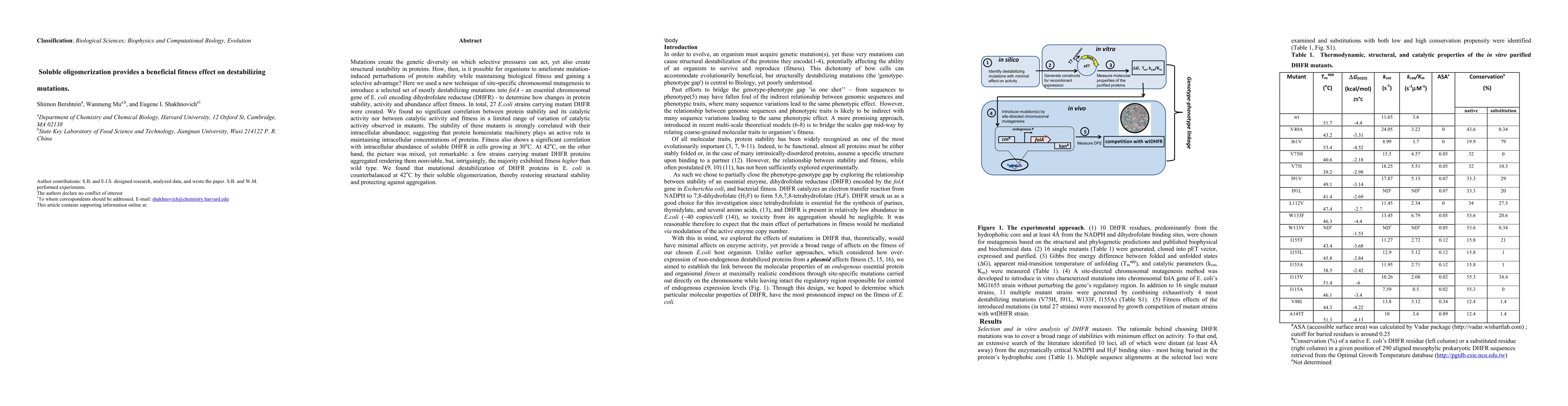 This study explores how destabilizing mutations in E. coli's folA gene, encoding dihydrofolate reductase, affect protein stability, activity, and fitness. Soluble oligomerization of mutant proteins at higher temperatures compensates for destabilization, maintaining stability and enhancing fitness, despite aggregation in some strains.