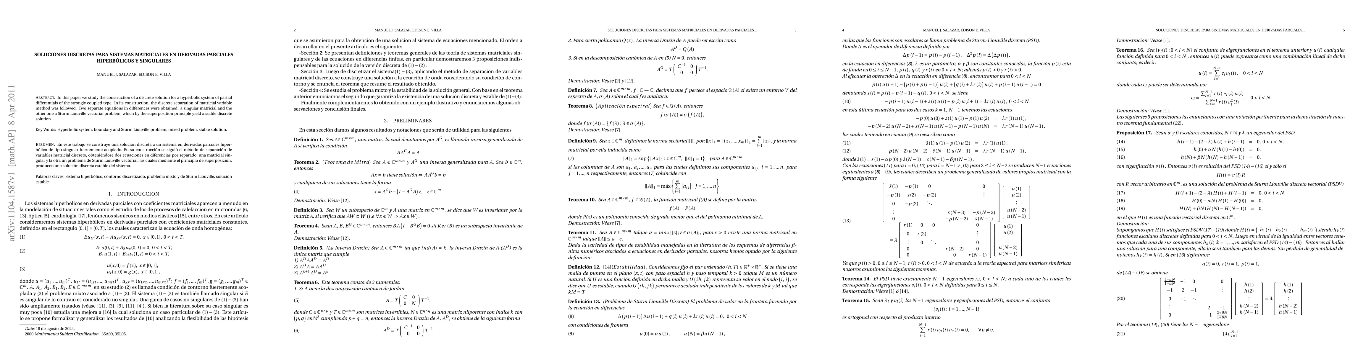 In this paper we study the construction of a discrete solution for a hyperbolic system of partial differentials of the strongly coupled type. In its construction, the discrete separation of matricial variable method was followed. Two separate equations in differences were obtained: a singular matricial and the other one a Sturm Liouville vectorial problem, which by the superposition principle yield a stable discrete solution.