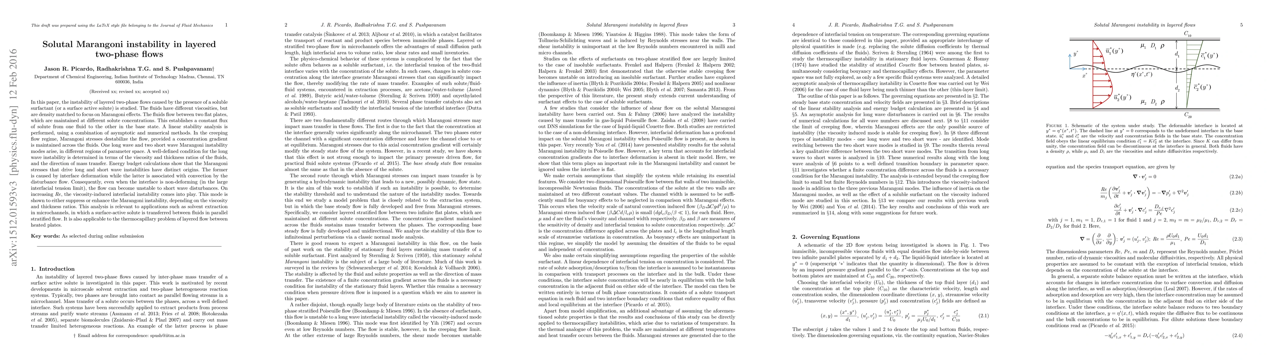 This paper investigates the Marangoni instability in layered two-phase flows driven by soluble surfactants, focusing on the effects of different fluid viscosities and density matching. Linear stability analysis reveals distinct long and short wave instabilities, with Marangoni stresses destabilizing the flow in the creeping flow regime.