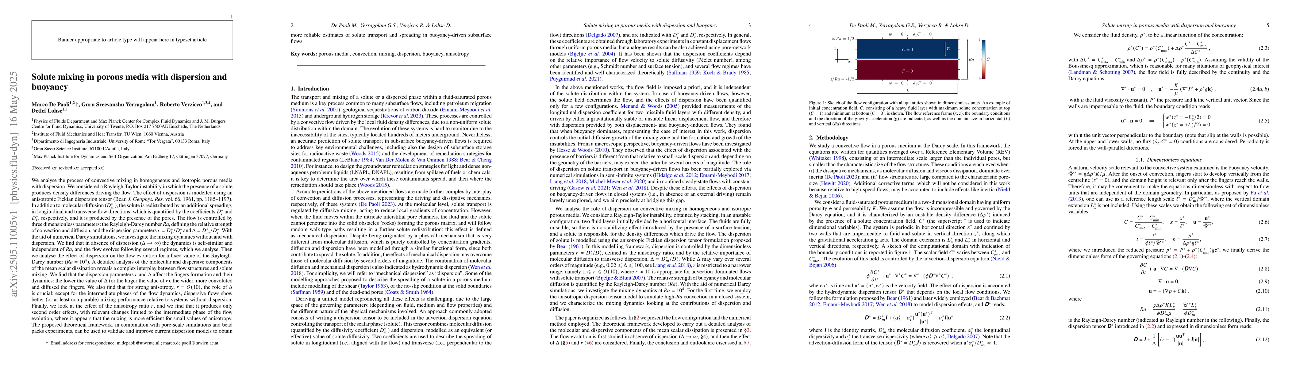 The research employs numerical Darcy simulations to analyze convective mixing in porous media with dispersion and buoyancy, using a Rayleigh-Taylor instability model and an anisotropic Fickian dispersion tensor.