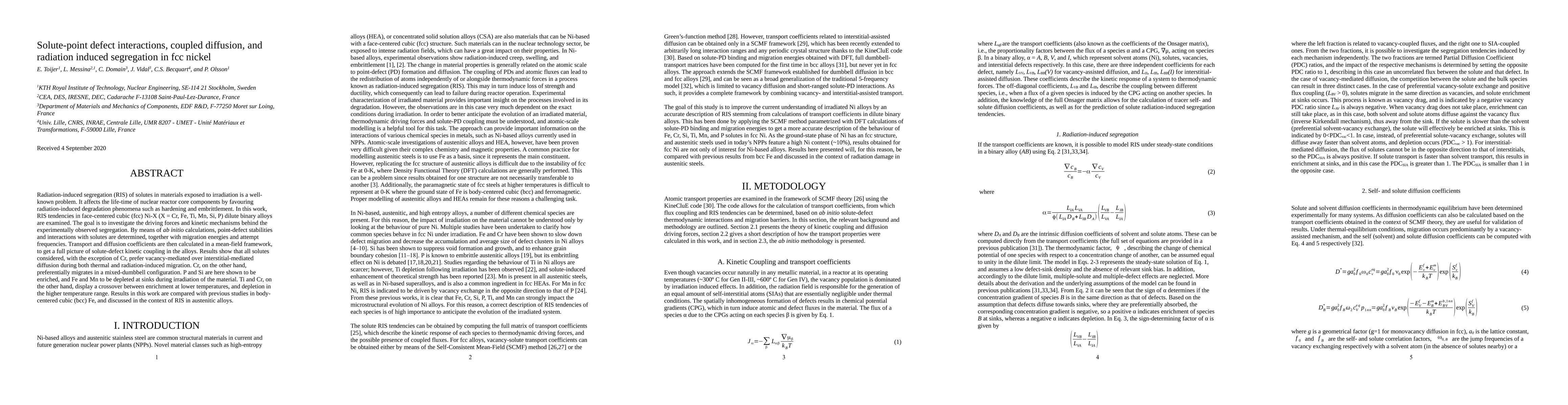 This study investigates the radiation-induced segregation (RIS) of solutes in fcc nickel alloys using ab initio calculations to determine solute-point defect interactions and diffusion mechanisms. Results show that most solutes prefer vacancy-mediated diffusion, with specific segregation behaviors observed for different solutes under irradiation.