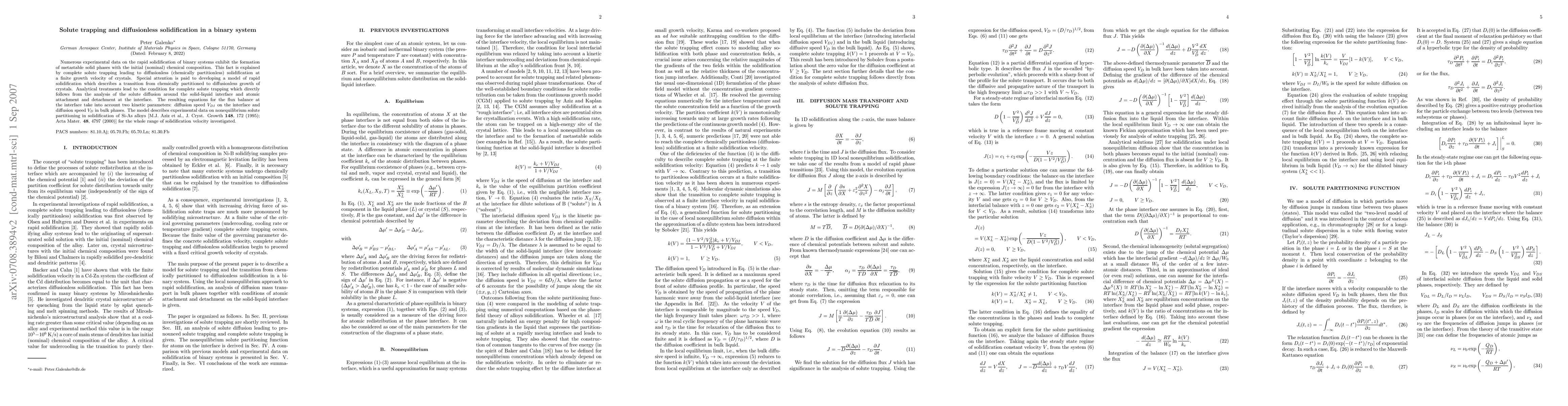 Numerous experimental data on the rapid solidification of binary systems exhibit the formation of metastable solid phases with the initial (nominal) chemical composition. This fact is explained by complete solute trapping leading to diffusionless (chemically partitionless) solidification at a finite growth velocity of crystals. Special attention is paid to developing a model of rapid solidification which describes a transition from chemically partitioned to diffusionless growth of crystals. Analytical treatments lead to the condition for complete solute trapping which directly follows from the analysis of the solute diffusion around the solid-liquid interface and atomic attachment and detachment at the interface. The resulting equations for the flux balance at the interface take into account two kinetic parameters: diffusion speed $V_{DI}$ on the interface and diffusion speed $V_D$ in bulk phases. The model describes experimental data on nonequilibrium solute partitioning in solidification of Si-As alloys [M.J. Aziz et al., J. Cryst. Growth {\bf 148}, 172 (1995); Acta Mater. {\bf 48}, 4797 (2000)] for the whole range of solidification velocity investigated.
