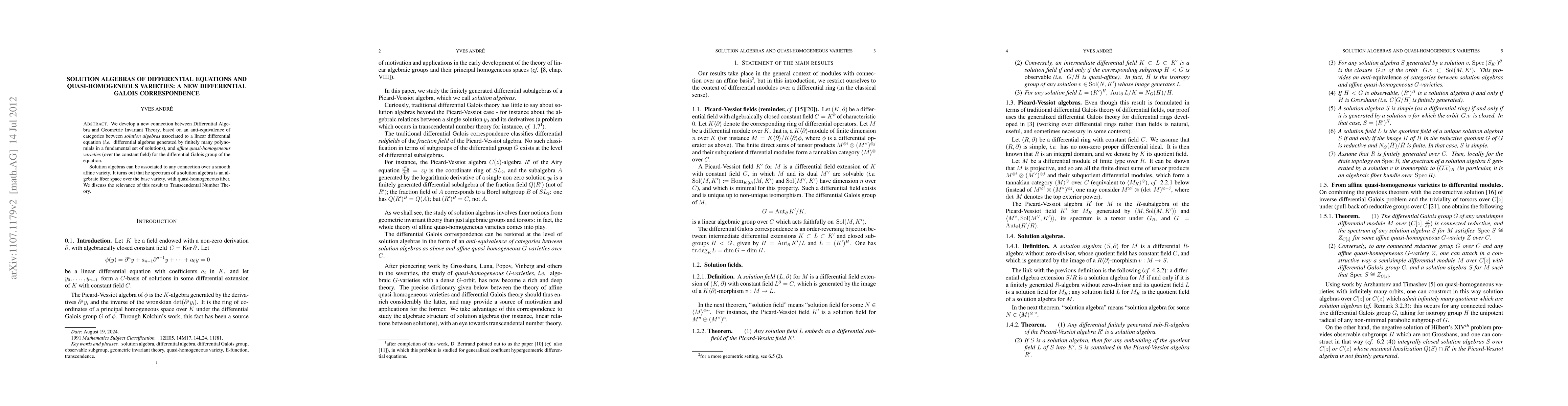 We develop a new connection between Differential Algebra and Geometric Invariant Theory, based on an anti-equivalence of categories between solution algebras associated to a linear differential equation (i.e. differential algebras generated by finitely many polynomials in a fundamental set of solutions), and affine quasi-homogeneous varieties (over the constant field) for the differential Galois group of the equation. Solution algebras can be associated to any connection over a smooth affine variety. It turns out that he spectrum of a solution algebra is an algebraic fiber space over the base variety, with quasi-homogeneous fiber. We discuss the relevance of this result to Transcendental Number Theory.