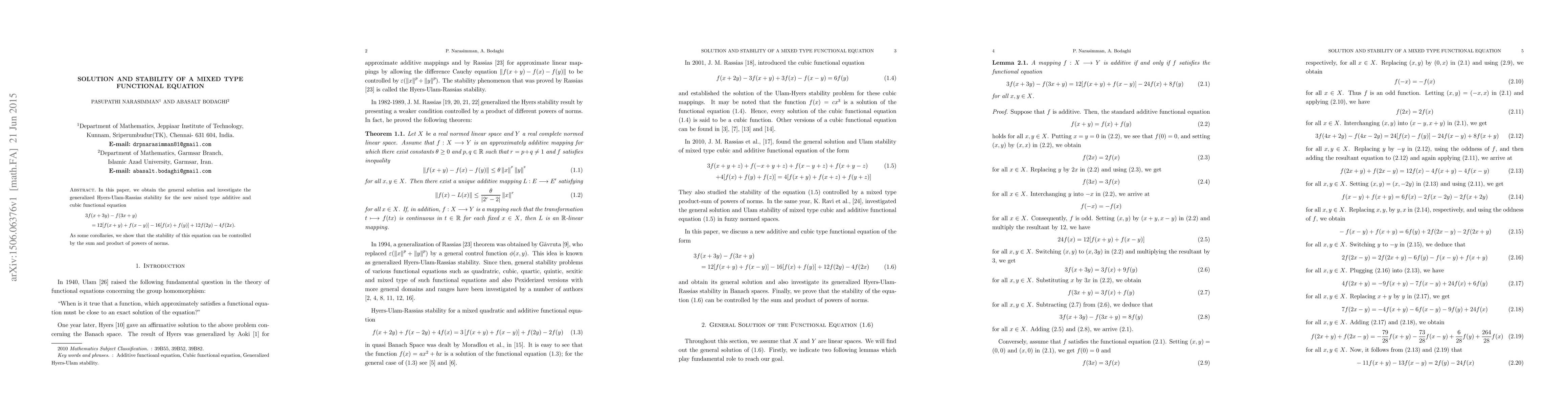 This paper finds the general solution and examines the generalized Hyers-Ulam-Rassias stability for a new mixed type functional equation involving additive and cubic terms. It demonstrates that the stability of the equation can be regulated by the sum and product of powers of norms.