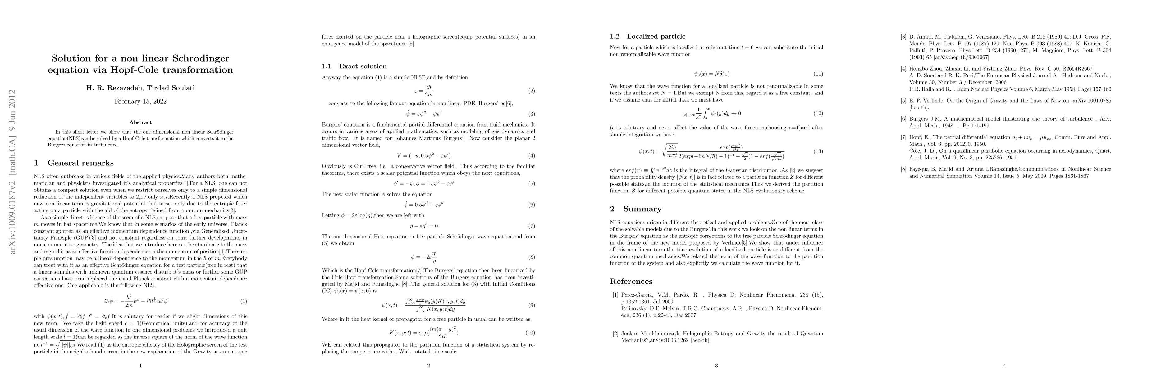 Summary: This paper demonstrates a method to solve the one-dimensional nonlinear Schrödinger equation (NLS) using a Hopf-Cole transformation, which simplifies it to the Burgers equation, commonly encountered in turbulence studies.