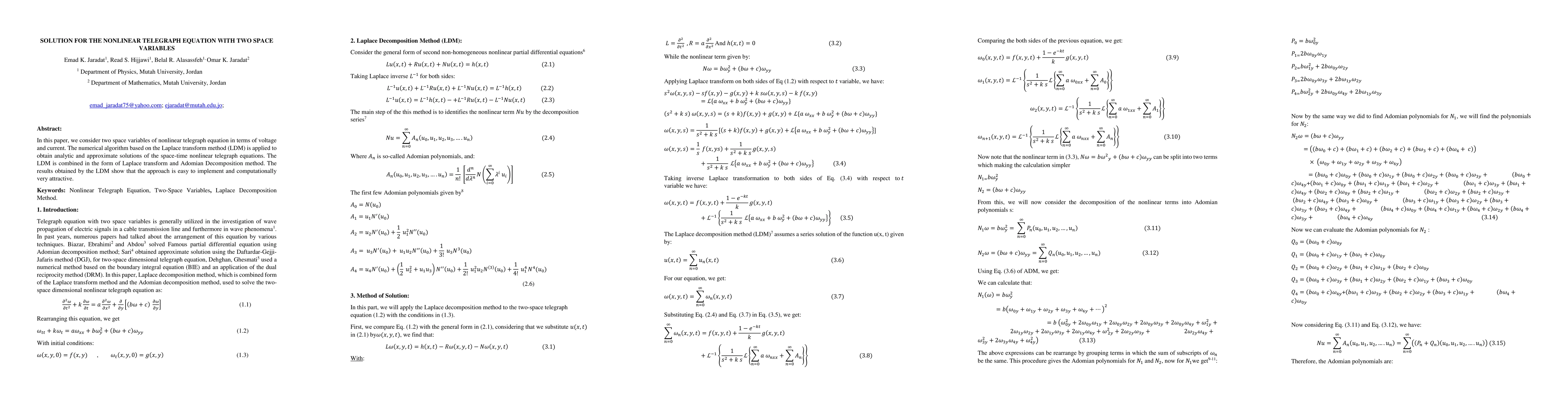 In this paper, we consider two space variables of nonlinear telegraph equation in terms of voltage and current. The numerical algorithm based on the Laplace transform method (LDM) is applied to obtain analytic and approximate solutions of the space-time nonlinear telegraph equations. The LDM is combined in the form of Laplace transform and Adomian Decomposition method. The results obtained by the LDM show that the approach is easy to implement and computationally very attractive.