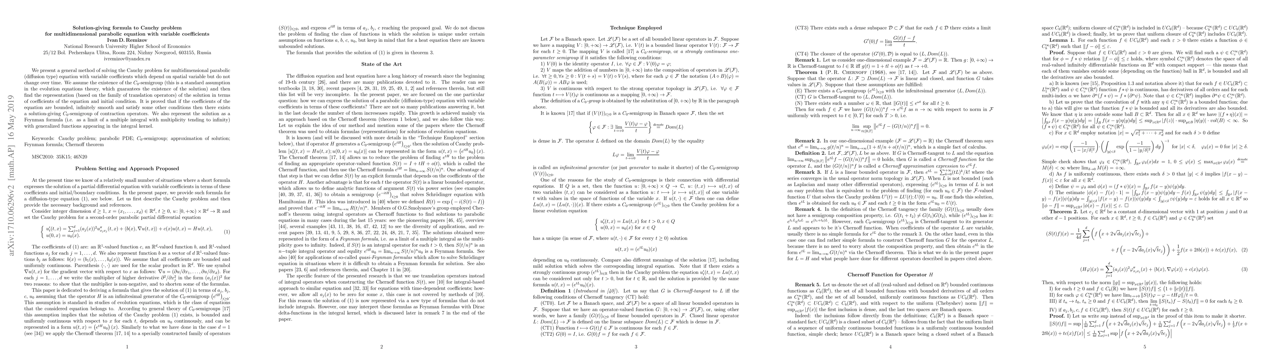 We present a general method of solving the Cauchy problem for multidimensional parabolic (diffusion type) equation with variable coefficients which depend on spatial variable but do not change over time. We assume the existence of the $C_0$-semigroup (this is a standard assumption in the evolution equations theory, which guarantees the existence of the solution) and then find the representation (based on the family of translation operators) of the solution in terms of coefficients of the equation and initial condition. It is proved that if the coefficients of the equation are bounded, infinitely smooth and satisfy some other conditions then there exists a solution-giving $C_0$-semigroup of contraction operators. We also represent the solution as a Feynman formula (i.e. as a limit of a multiple integral with multiplicity tending to infinity) with generalized functions appearing in the integral kernel.