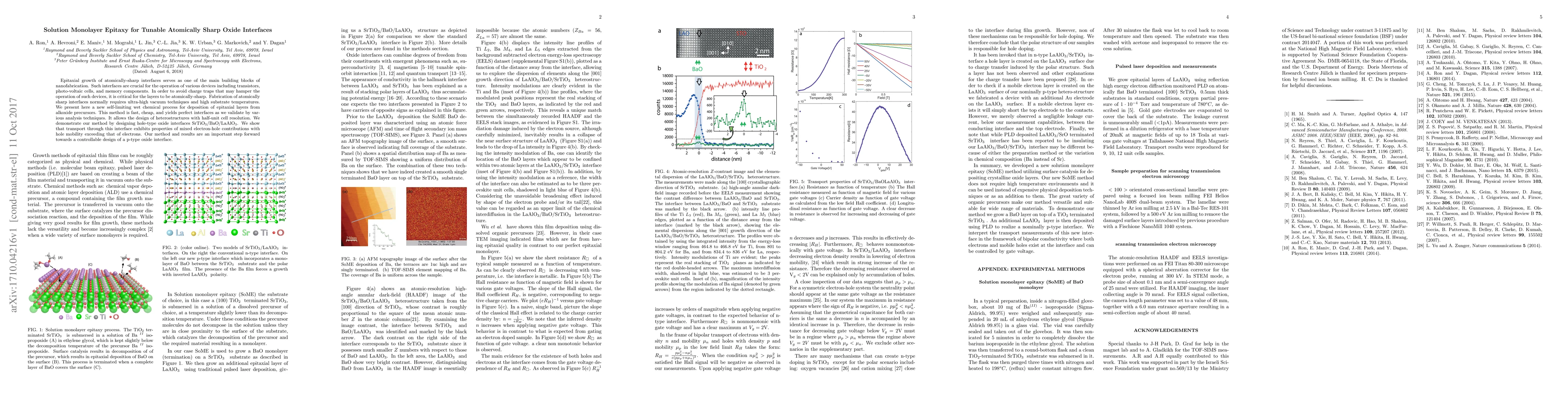 Epitaxial growth of atomically-sharp interfaces serves as one of the main building blocks of nanofabrication. Such interfaces are crucial for the operation of various devices including transistors, photo-voltaic cells, and memory components. In order to avoid charge traps that may hamper the operation of such devices, it is critical for the layers to be atomically-sharp. Fabrication of atomically sharp interfaces normally requires ultra-high vacuum techniques and high substrate temperatures. We present here a new self-limiting wet chemical process for deposition of epitaxial layers from alkoxide precursors. This method is fast, cheap, and yields perfect interfaces as we validate by various analysis techniques. It allows the design of heterostructures with half-unit cell resolution. We demonstrate our method by designing hole-type oxide interfaces SrTiO3/BaO/LaAlO3. We show that transport through this interface exhibits properties of mixed electron-hole contributions with hole mobility exceeding that of electrons. Our method and results are an important step forward towards a controllable design of a p-type oxide interface.