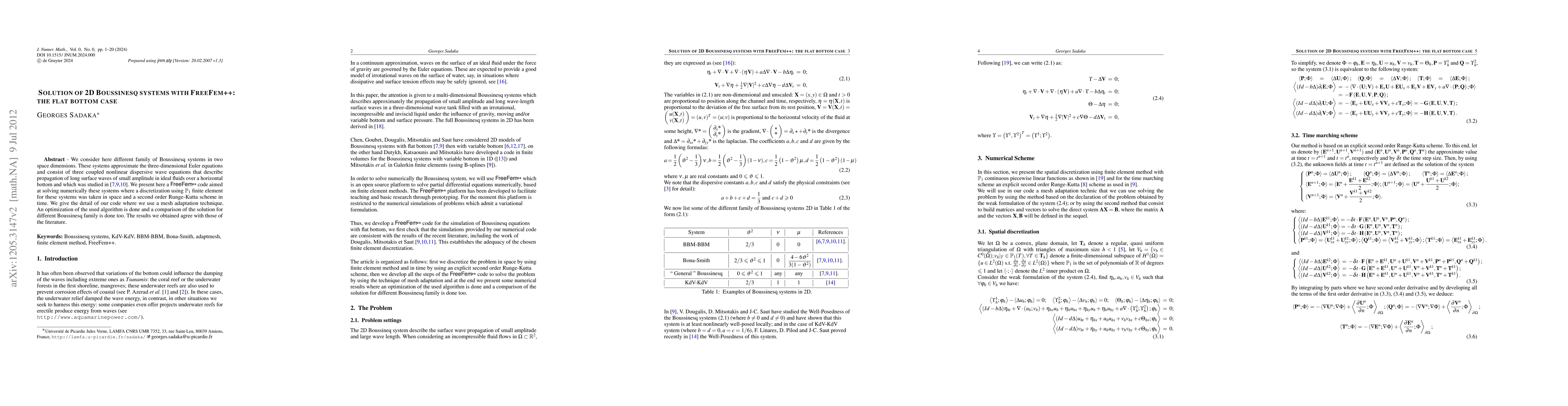 This paper presents a FreeFem++ code for numerically solving 2D Boussinesq systems, which approximate the three-dimensional Euler equations for long surface waves. The code uses P1 finite element discretization and a second-order Runge-Kutta scheme, with mesh adaptation and algorithm optimization, yielding results consistent with existing literature.