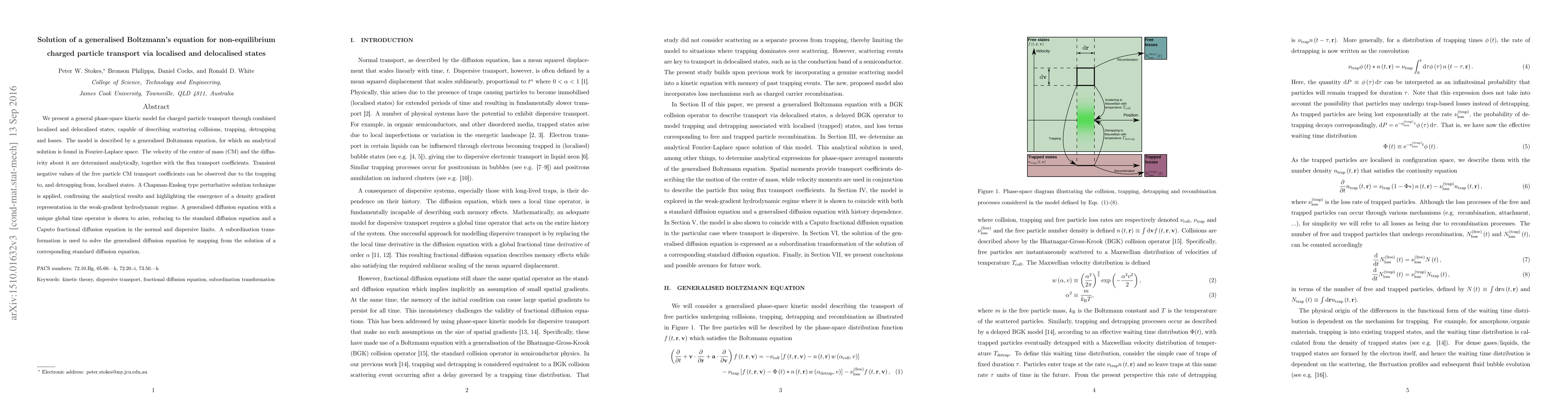 We present a general phase-space kinetic model for charged particle transport through combined localised and delocalised states, capable of describing scattering collisions, trapping, detrapping and losses. The model is described by a generalised Boltzmann equation, for which an analytical solution is found in Fourier-Laplace space. The velocity of the centre of mass (CM) and the diffusivity about it are determined analytically, together with the flux transport coefficients. Transient negative values of the free particle CM transport coefficients can be observed due to the trapping to, and detrapping from, localised states. A Chapman-Enskog type perturbative solution technique is applied, confirming the analytical results and highlighting the emergence of a density gradient representation in the weak-gradient hydrodynamic regime. A generalised diffusion equation with a unique global time operator is shown to arise, reducing to the standard diffusion equation and a Caputo fractional diffusion equation in the normal and dispersive limits. A subordination transformation is used to solve the generalised diffusion equation by mapping from the solution of a corresponding standard diffusion equation.