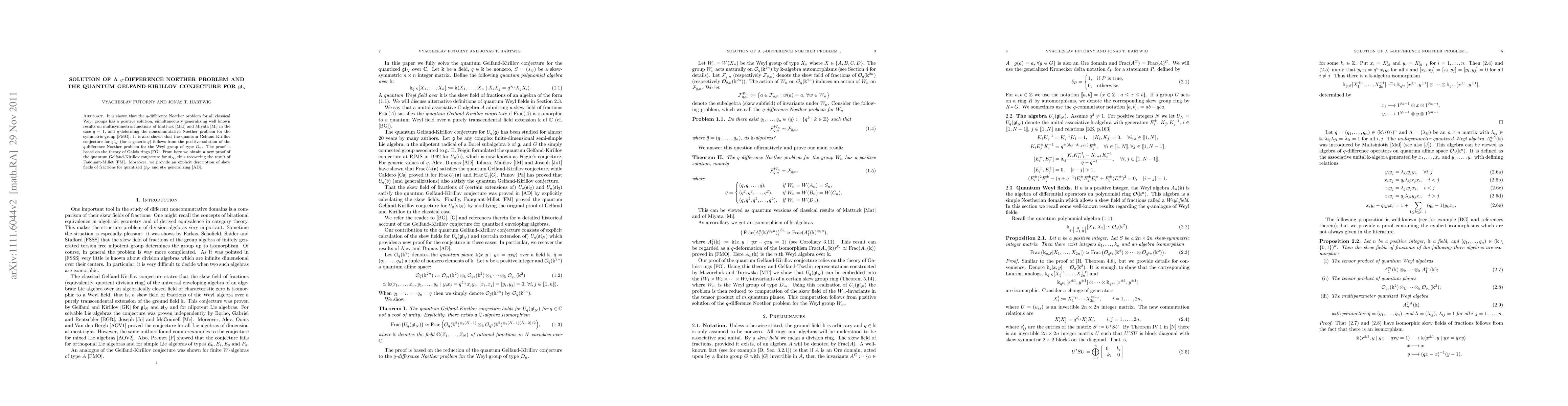 This paper resolves the q-difference Noether problem for classical Weyl groups, providing a positive solution that generalizes results for multisymmetric functions and noncommutative Noether problems. It also proves the quantum Gelfand-Kirillov conjecture for gl_N using the theory of Galois rings, offering a new proof for sl_N and an explicit description of their skew fields of fractions.