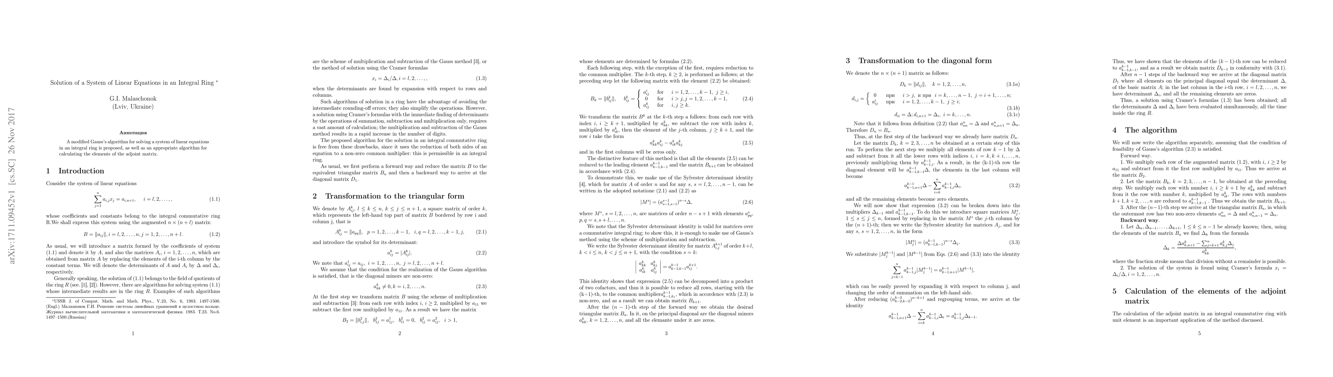 A modified Gauss's algorithm for solving a system of linear equations in an integral ring is proposed, as well as an appropriate algorithm for calculating the elements of the adjoint matrix.