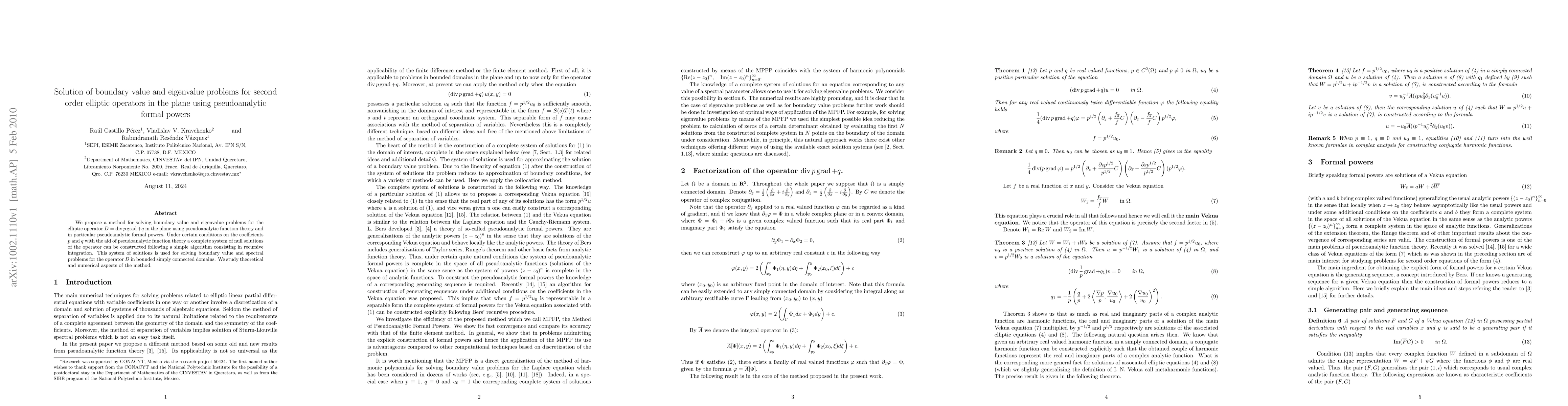 We propose a method for solving boundary value and eigenvalue problems for the elliptic operator D=divpgrad+q in the plane using pseudoanalytic function theory and in particular pseudoanalytic formal powers. Under certain conditions on the coefficients p and q with the aid of pseudoanalytic function theory a complete system of null solutions of the operator can be constructed following a simple algorithm consisting in recursive integration. This system of solutions is used for solving boundary value and spectral problems for the operator D in bounded simply connected domains. We study theoretical and numerical aspects of the method.