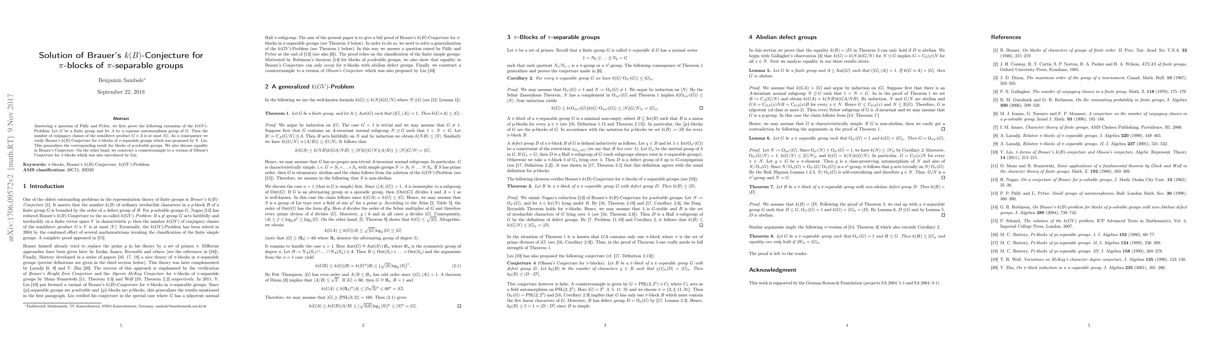 Answering a question of P\'alfy and Pyber, we first prove the following extension of the k(GV)-Problem: Let G be a finite group and A\le Aut(G) such that (|G|,|A|)=1. Then the number of conjugacy classes of the semidirect product GA is at most |G|. As a consequence we verify Brauer's k(B)-Conjecture for pi-blocks of pi-separable groups which was proposed by Y. Liu. We also discuss equality in Brauer's Conjecture. On the other hand, we construct a counterexample to a version of Olsson's Conjecture for pi-blocks which was also introduced by Liu.
