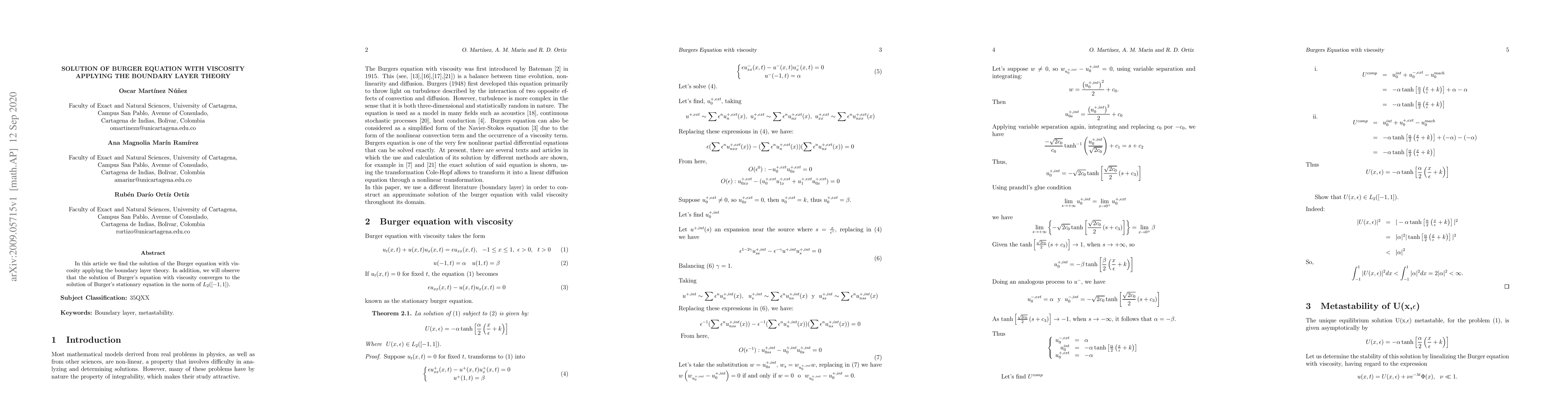 Researchers found a solution to the Burger equation with viscosity using boundary layer theory, which converges to the stationary solution in L2 norm.