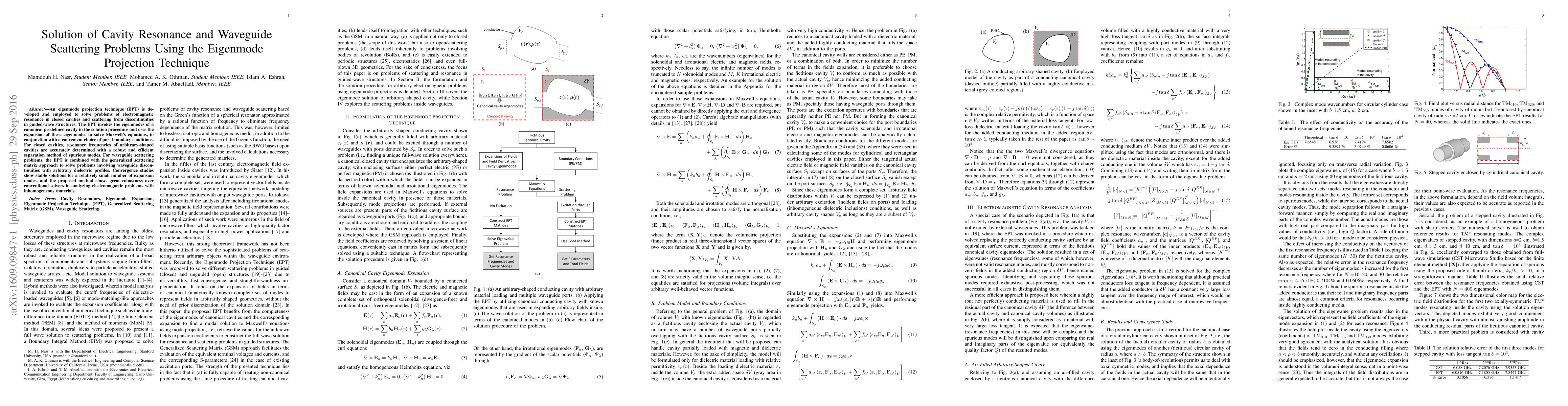 The paper presents an eigenmode projection technique (EPT) to solve electromagnetic resonance in closed cavities and scattering in waveguides, achieving accurate results with robust separation of spurious modes and stable convergence. The method combines EPT with the generalized scattering matrix for analyzing waveguide discontinuities with arbitrary dielectric profiles.
