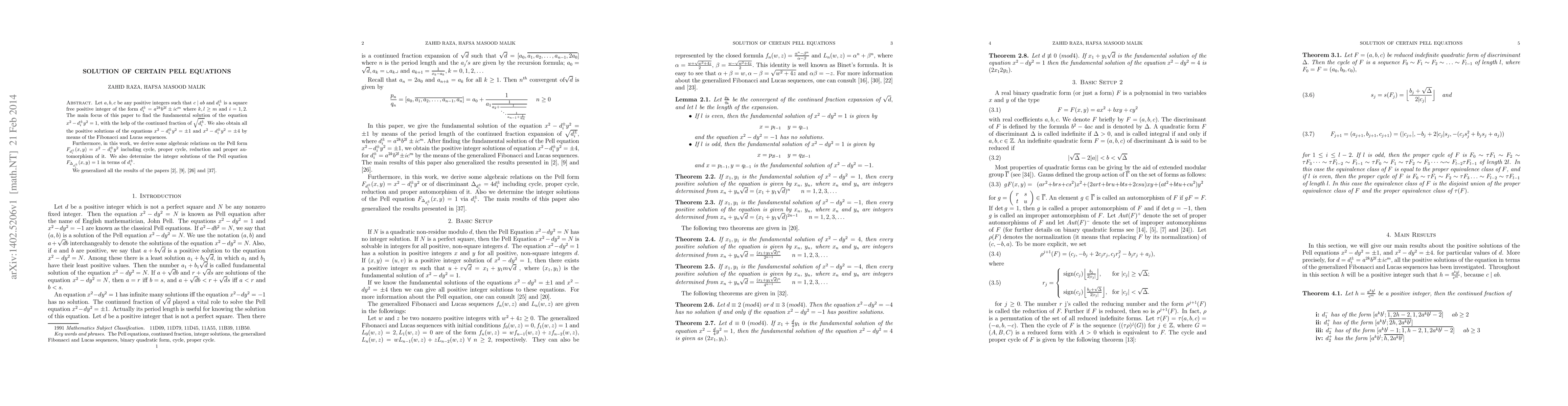 Let $a,b,c $ be any positive integers such that $c\mid ab$ and $d_i^\pm$ is a square free positive integer of the form $d_i^\pm=a^{2k} b^{2l}\pm i c^m$ where $k,l \geq m$ and $i=1,2.$ The main focus of this paper to find the fundamental solution of the equation $ x^2-d_i^\pm y^2=1$ with the help of the continued fraction of $\sqrt{d_i^\pm}.$ We also obtain all the positive solutions of the equations $ x^2-d_i^\pm y^2=\pm 1$ and $ x^2-d_i^\pm y^2=\pm 4$ by means of the Fibonacci and Lucas sequences. Furthermore, in this work, we derive some algebraic relations on the Pell form $ F_{d_i^\pm}(x, y) = x^2-d_i^\pm y^2 $ including cycle, proper cycle, reduction and proper automorphism of it. We also determine the integer solutions of the Pell equation $ F_{\Delta_{d_i^\pm}} (x, y) = 1 $ in terms of $d_i^\pm. We generalized all the results of the papers [2], [9], [26], and [37].