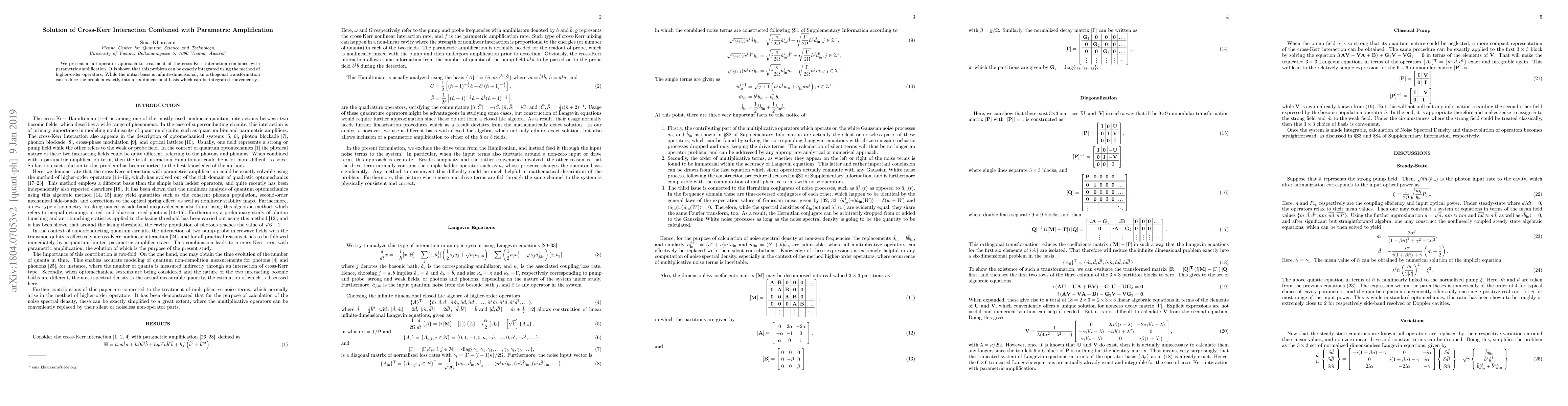 Researchers developed a method to solve the cross-Kerr interaction with parametric amplification using a full operator approach, reducing it to a six-dimensional basis that can be integrated conveniently.