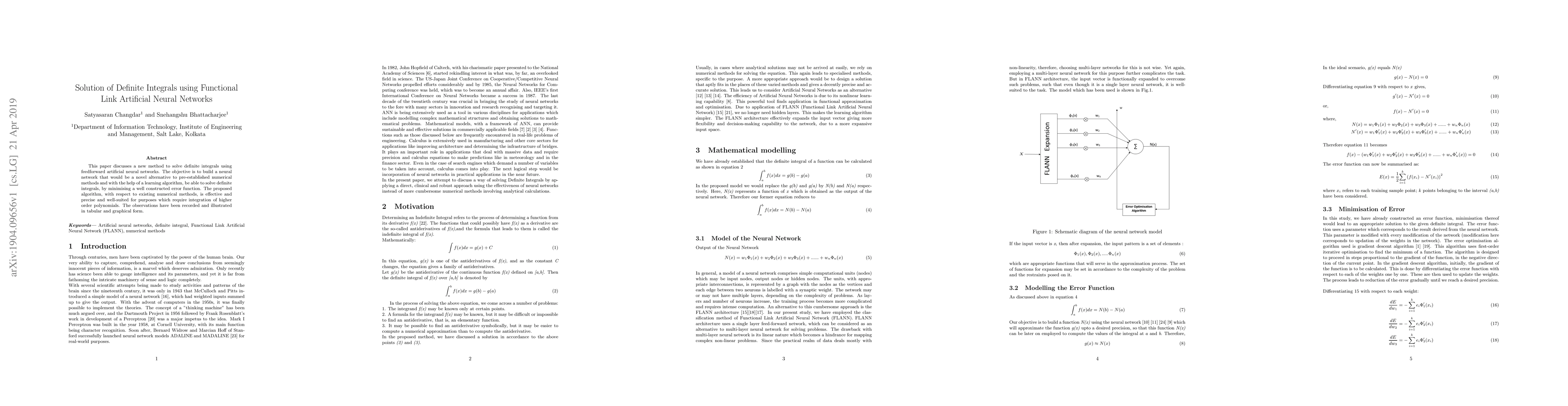 This paper discusses a new method to solve definite integrals using artificial neural networks. The objective is to build a neural network that would be a novel alternative to pre-established numerical methods and with the help of a learning algorithm, be able to solve definite integrals, by minimising a well constructed error function. The proposed algorithm, with respect to existing numerical methods, is effective and precise and well-suited for purposes which require integration of higher order polynomials. The observations have been recorded and illustrated in tabular and graphical form.