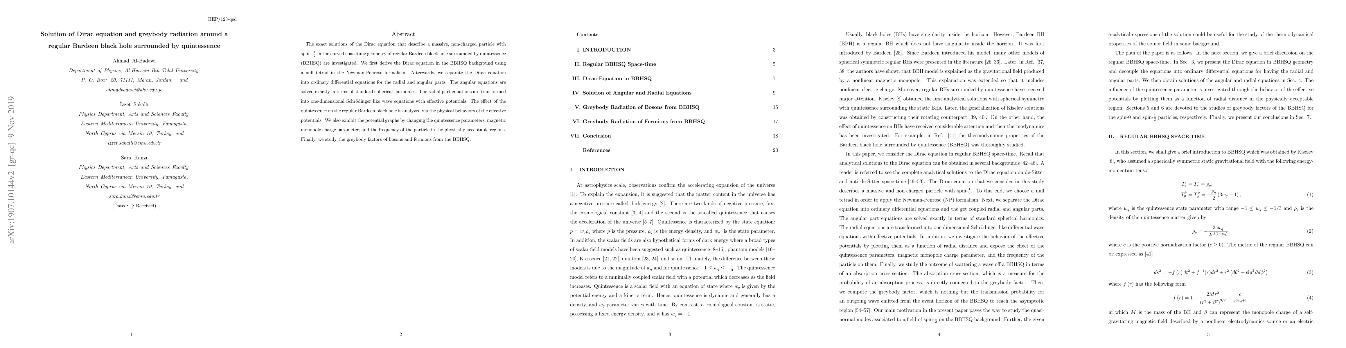 This paper investigates the exact solutions of the Dirac equation for a massive, spin-(1/2) particle around a regular Bardeen black hole surrounded by quintessence, deriving effective potentials and studying greybody radiation. The angular part is solved using spherical harmonics, and the radial part is transformed into Schrödinger-like equations.