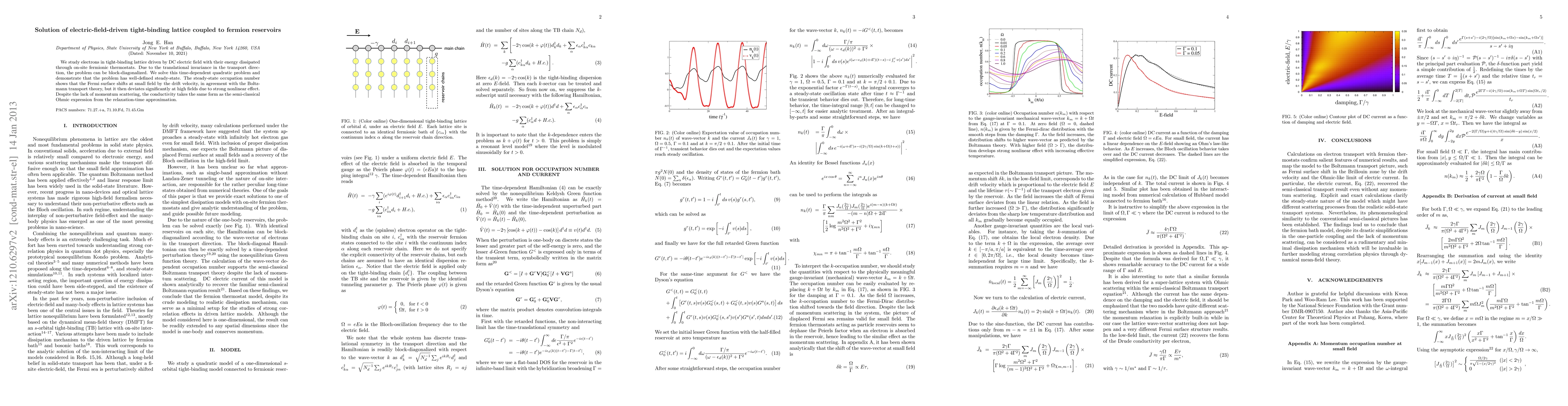 Electrons in tight-binding lattice driven by DC electric field dissipate their energy through on-site fermionic thermostats. Due to the translational invariance in the transport direction, the problem can be block-diagonalized. We solve this time-dependent quadratic problem and demonstrate that the problem has an oscillatory steady-state. The steady-state occupation number shows that the Fermi surface disappears for any damping from the thermostats and any finite electric field. Despite the lack of momentum scattering, the conductivity takes the same form as the semi-classical Ohmic expression from the relaxation-time approximation.