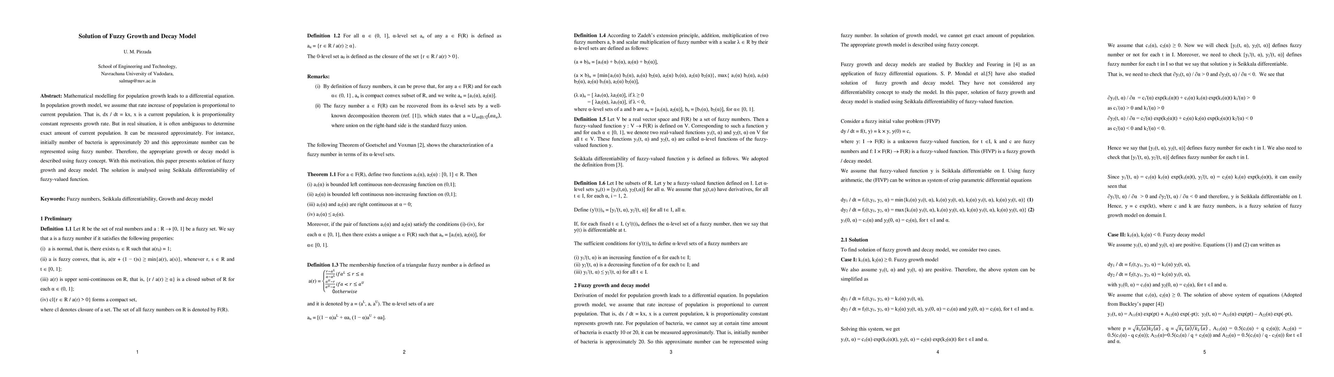 Mathematical modelling for population growth leads to a differential equation. In population growth model, we assume that rate increase of population is proportional to current population. That is, dx / dt = kx, x is a current population, k is proportionality constant represents growth rate. But in real situation, it is often ambiguous to determine exact amount of current population. It can be measured approximately. For instance, initially number of bacteria is approximately 20 and this approximate number can be represented using fuzzy number. Therefore, the appropriate growth or decay model is described using fuzzy concept. With this motivation, this paper presents solution of fuzzy growth and decay model. The solution is analysed using Seikkala differentiability of fuzzy-valued function.