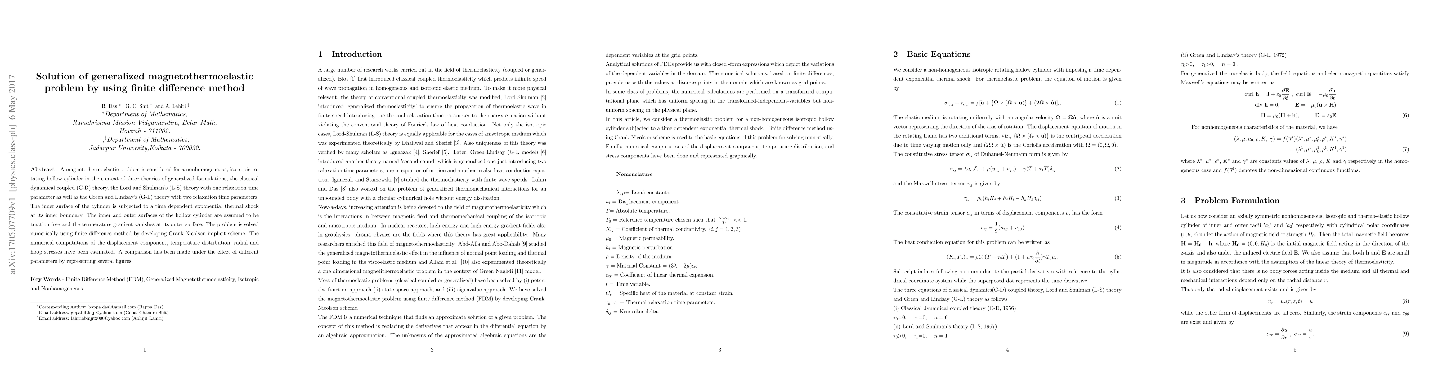 A magnetothermoelastic problem is considered for a nonhomogeneous, isotropic rotating hollow cylinder in the context of three theories of generalized formulations, the classical dynamical coupled (C-D) theory, the Lord and Shulman's (L-S) theory with one relaxation time parameter as well as the Green and Lindsay's (G-L) theory with two relaxation time parameters. The inner surface of the cylinder is subjected to a time dependent exponential thermal shock at its inner boundary. The inner and outer surfaces of the hollow cylinder are assumed to be traction free and the temperature gradient vanishes at its outer surface. The problem is solved numerically using finite difference method by developing Crank-Nicolson implicit scheme. The numerical computations of the displacement component, temperature distribution, radial and hoop stresses have been estimated. A comparison has been made under the effect of different parameters by representing several figures.