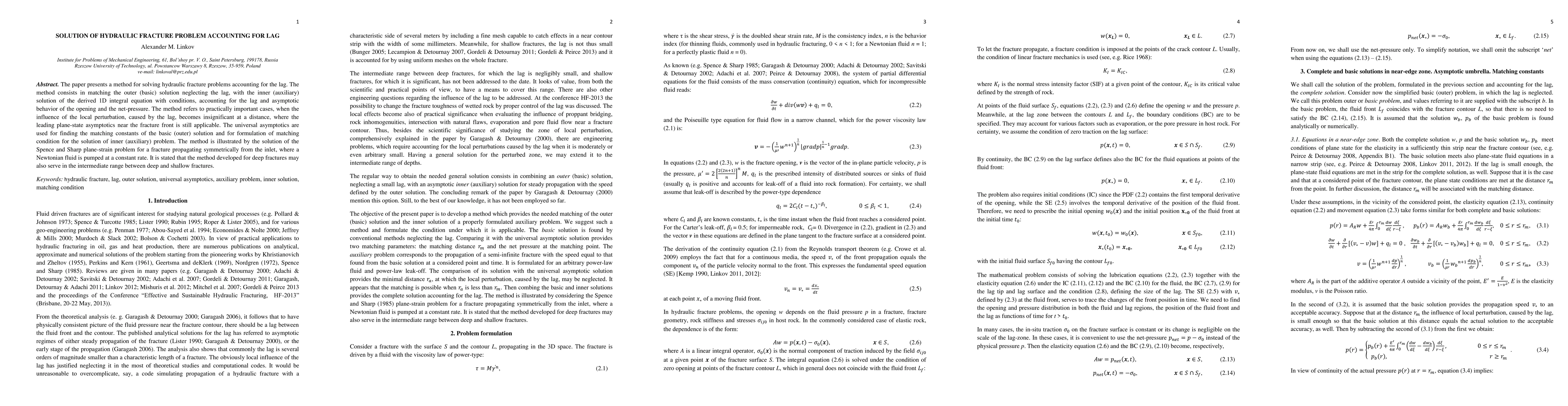 The paper presents a method for solving hydraulic fracture problems accounting for the lag. The method consists in matching the outer (basic) solution neglecting the lag, with the inner (auxiliary) solution of the derived 1D integral equation with conditions, accounting for the lag and asymptotic behavior of the opening and the net-pressure. The method refers to practically important cases, when the influence of the local perturbation, caused by the lag, becomes insignificant at a distance, where the leading plane-state asymptotics near the fracture front is still applicable. The universal asymptotics are used for finding the matching constants of the basic (outer) solution and for formulation of matching condition for the solution of inner (auxiliary) problem. The method is illustrated by the solution of the Spence and Sharp plane-strain problem for a fracture propagating symmetrically from the inlet, where a Newtonian fluid is pumped at a constant rate. It is stated that the method developed for deep fractures may also serve in the intermediate range between deep and shallow fractures.