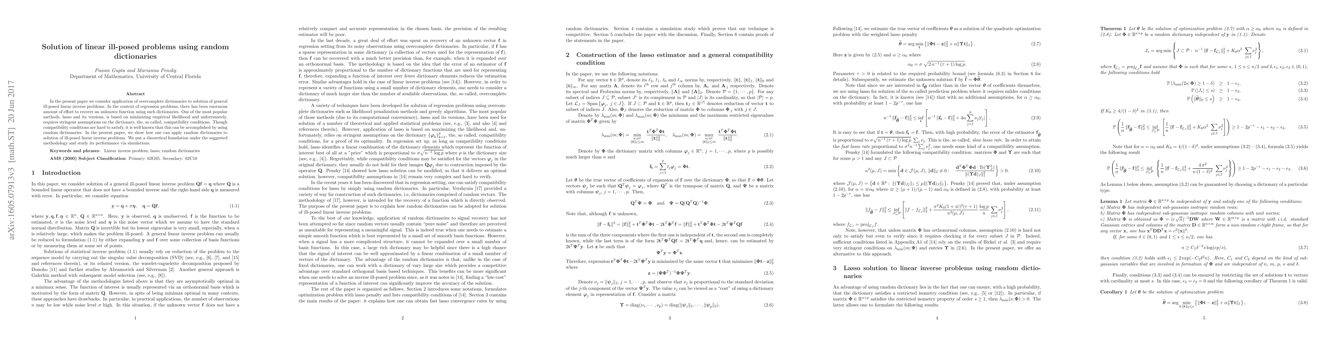 The paper introduces a theoretical framework for using random dictionaries in solving ill-posed linear inverse problems, backed by simulation studies demonstrating superior performance compared to SVD estimators.