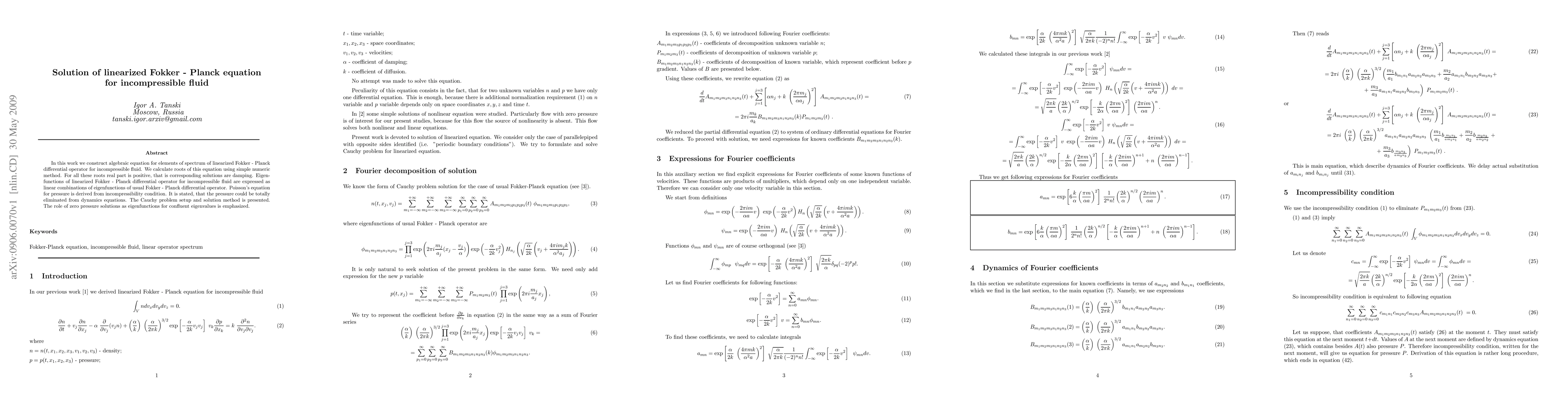 In this work we construct algebraic equation for elements of spectrum of linearized Fokker - Planck differential operator for incompressible fluid. We calculate roots of this equation using simple numeric method. For all these roots real part is positive, that is corresponding solutions are damping. Eigenfunctions of linearized Fokker - Planck differential operator for incompressible fluid are expressed as linear combinations of eigenfunctions of usual Fokker - Planck differential operator. Poisson's equation for pressure is derived from incompressibility condition. It is stated, that the pressure could be totally eliminated from dynamics equations. The Cauchy problem setup and solution method is presented. The role of zero pressure solutions as eigenfunctions for confluent eigenvalues is emphasized.