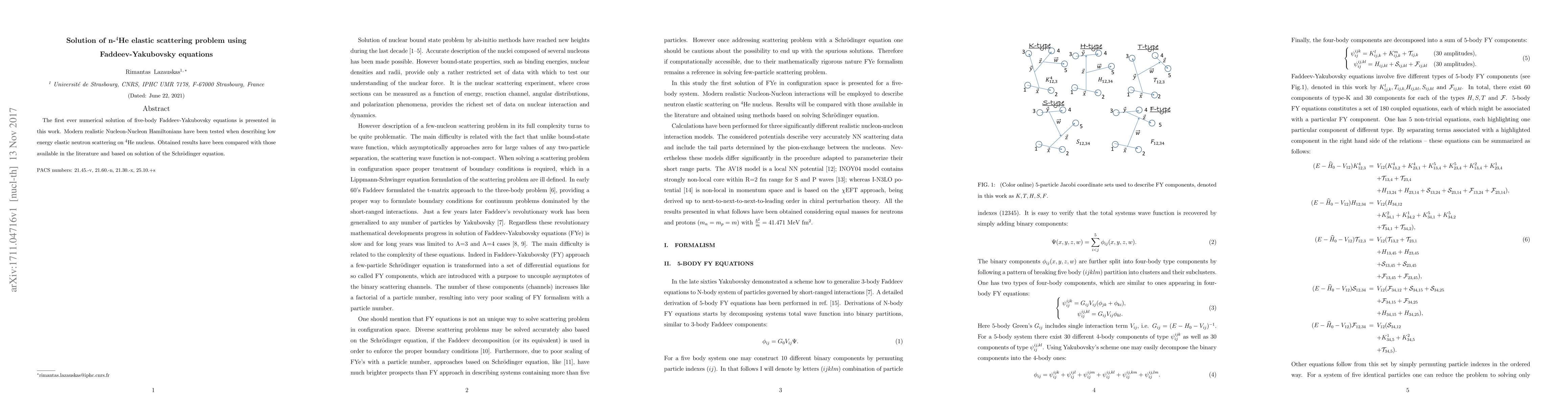 The first ever numerical solution of five-body Faddeev-Yakubovsky equations is presented in this work. Modern realistic Nucleon-Nucleon Hamiltonians have been tested when describing low energy elastic neutron scattering on $^4$He nucleus. Obtained results have been compared with those available in the literature and based on solution of the Schr\"odinger equation.