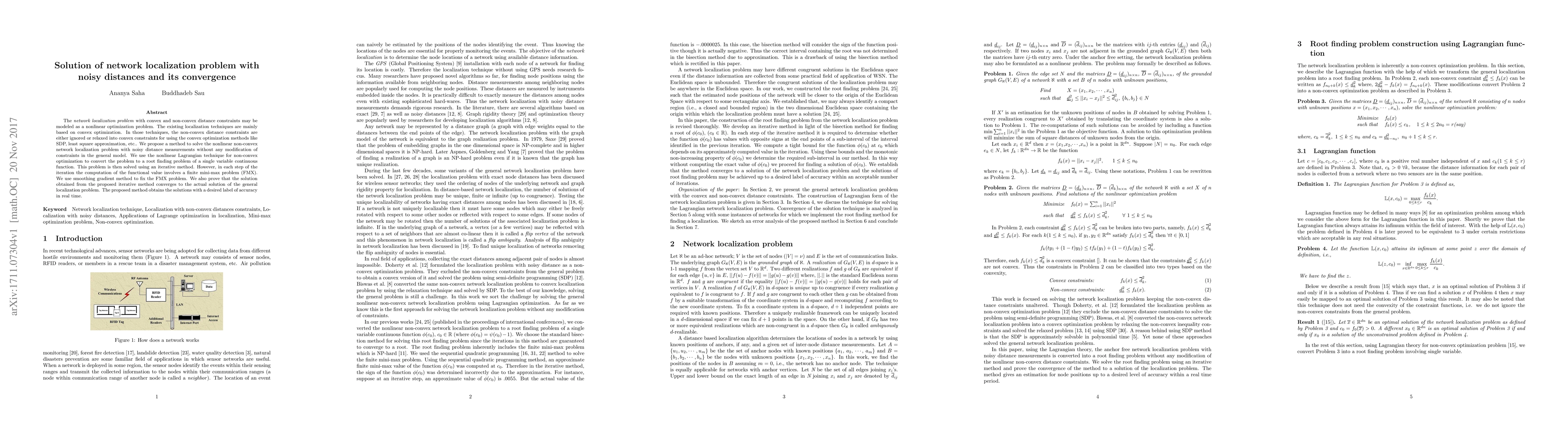 The network localization problem with convex and non-convex distance constraints may be modeled as a nonlinear optimization problem. The existing localization techniques are mainly based on convex optimization. In those techniques, the non-convex distance constraints are either ignored or relaxed into convex constraints for using the convex optimization methods like SDP, least square approximation, etc.. We propose a method to solve the nonlinear non-convex network localization problem with noisy distance measurements without any modification of constraints in the general model. We use the nonlinear Lagrangian technique for non-convex optimization to convert the problem to a root finding problem of a single variable continuous function. This problem is then solved using an iterative method. However, in each step of the iteration the computation of the functional value involves a finite mini-max problem (FMX). We use smoothing gradient method to fix the FMX problem. We also prove that the solution obtained from the proposed iterative method converges to the actual solution of the general localization problem. The proposed method obtains the solutions with a desired label of accuracy in real time.