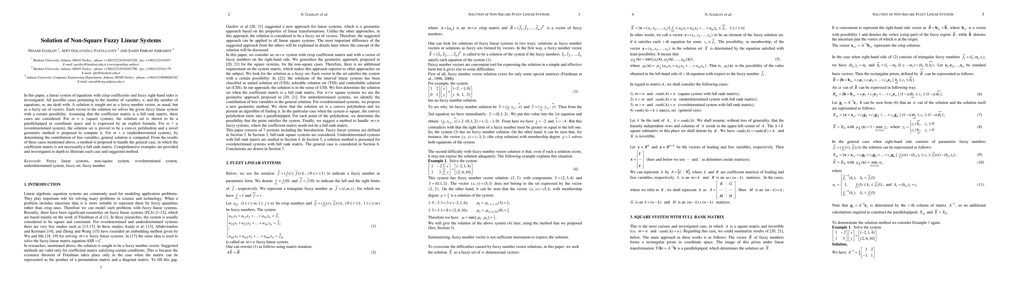This paper explores non-square fuzzy linear systems, presenting solutions as fuzzy sets of vectors rather than single fuzzy vectors. It covers three cases: square systems yield a parallelepiped solution, overdetermined systems result in a convex polyhedron, and underdetermined systems involve free variable contributions. A method for handling non-full rank matrices is also proposed.