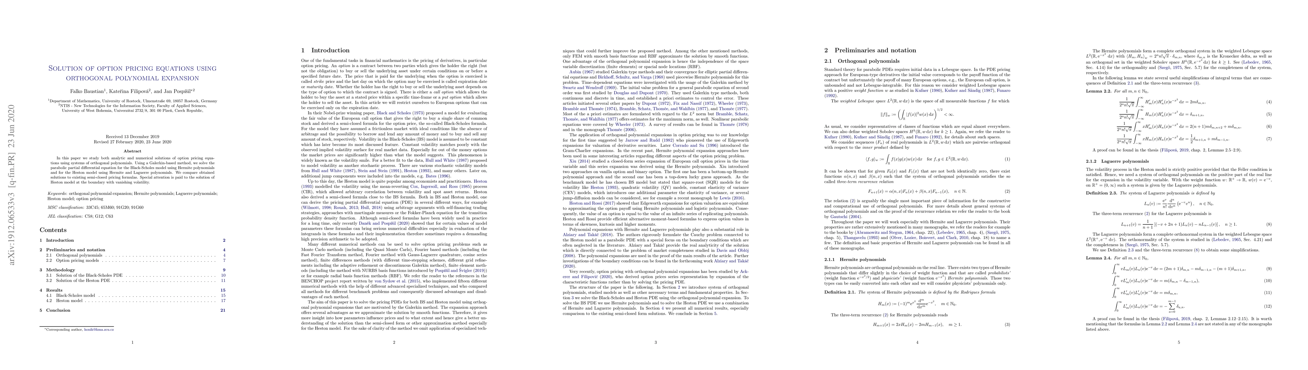 This paper uses orthogonal polynomial expansion to solve option pricing equations for the Black-Scholes model and Heston model, comparing results with existing semi-closed formulas.