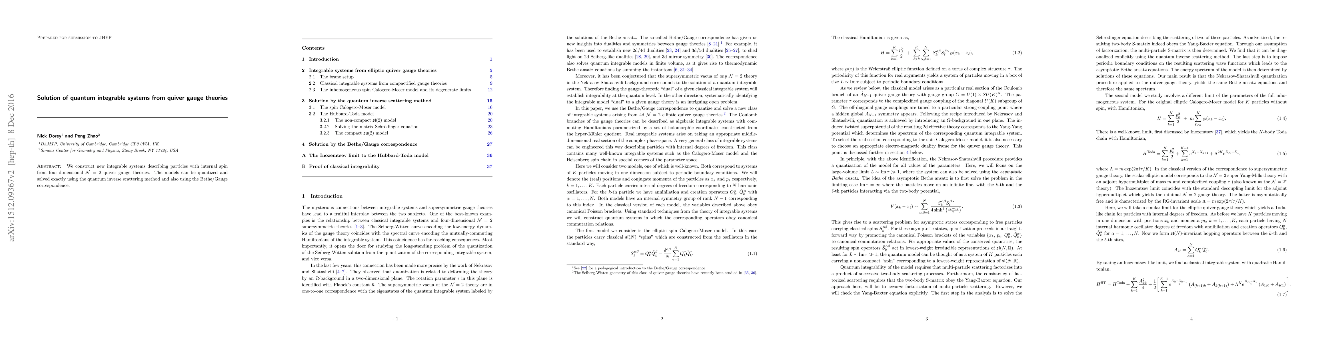 We construct new integrable systems describing particles with internal spin from four-dimensional $\mathcal{N}=2$ quiver gauge theories. The models can be quantized and solved exactly using the quantum inverse scattering method and also using the Bethe/Gauge correspondence.
