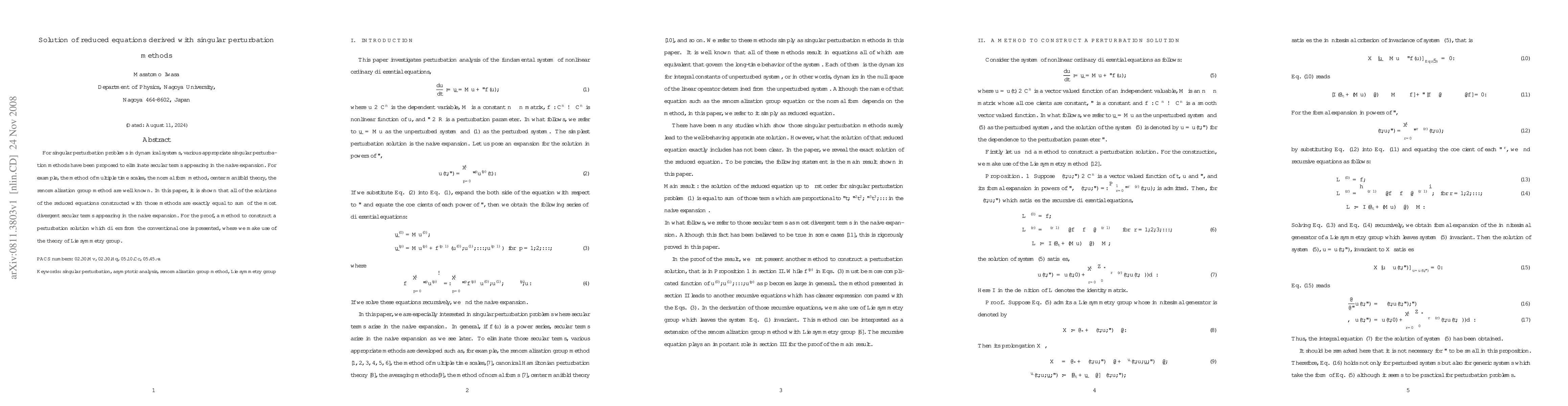 This paper demonstrates that solutions of reduced equations derived from various singular perturbation methods (e.g., multiple time scales, normal form method) are equivalent to the sum of the most divergent secular terms in naive expansions. The proof utilizes a novel perturbation solution method based on Lie symmetry group theory.