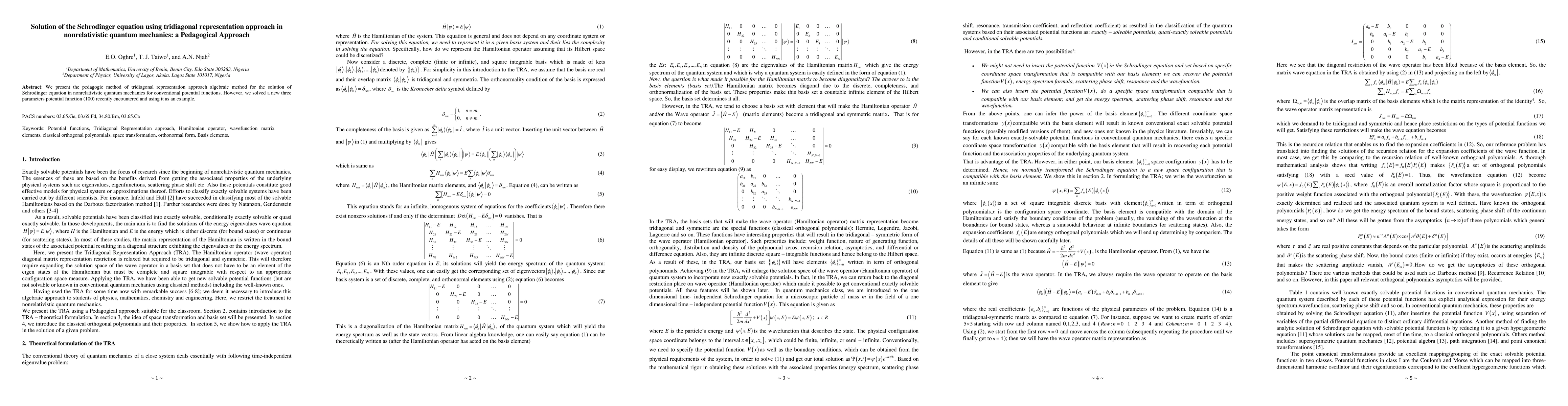 Summary: This paper introduces a pedagogical method using the Tridiagonal representation approach to solve the Schrödinger equation in nonrelativistic quantum mechanics, demonstrating its application with a new three-parameter potential function. The method provides an algebraic solution for conventional potentials.