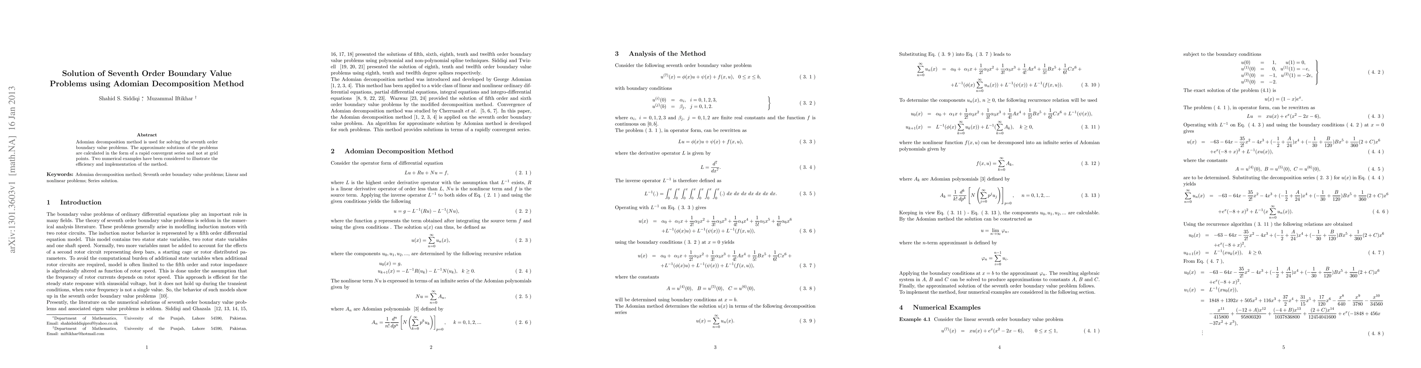 This paper employs the Adomian decomposition method to solve seventh-order boundary value problems, providing rapid convergent series solutions without grid points. Two numerical examples demonstrate the method's efficiency and practical implementation.