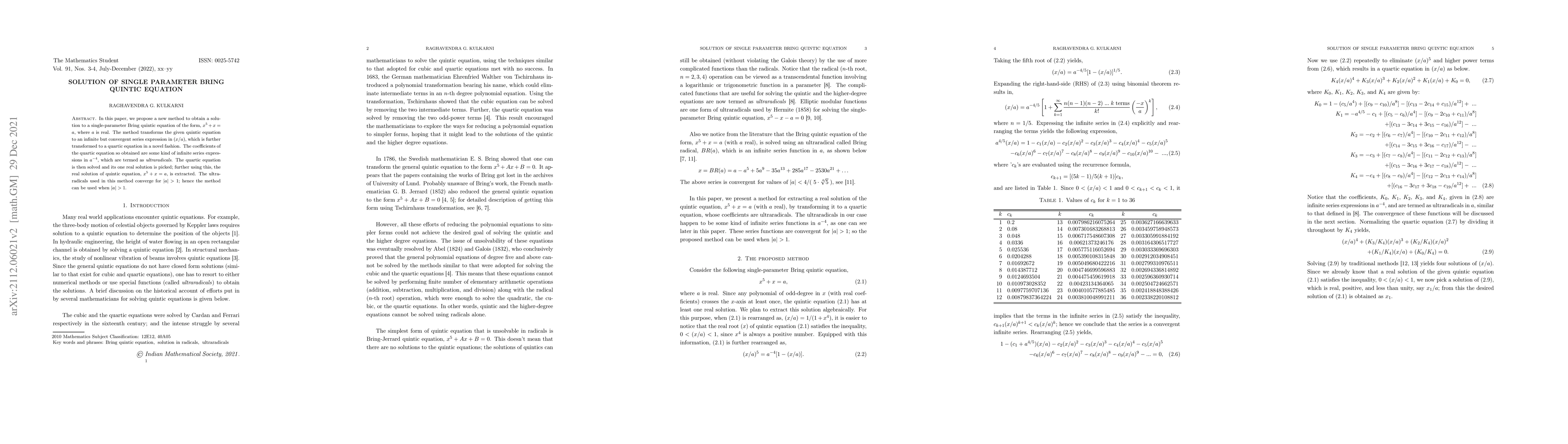 In this paper, we propose a new method to obtain a solution to a single-parameter Bring quintic equation of the form, $x^{5}+x=a$, where $a$ is real. The method transforms the given quintic equation to an infinite but convergent series expression in $(x/a)$, which is further transformed to a quartic equation in a novel fashion. The coefficients of the quartic equation so obtained are some kind of infinite series expressions in $a^{-4}$, which are termed as \textit{ultraradicals}. The quartic equation is then solved and its one real solution is picked; further using this, the real solution of quintic equation, $x^{5}+x=a,$ is extracted. The ultraradicals used in this method converge for $|a| > 1$; hence the method can be used when $|a| > 1$.