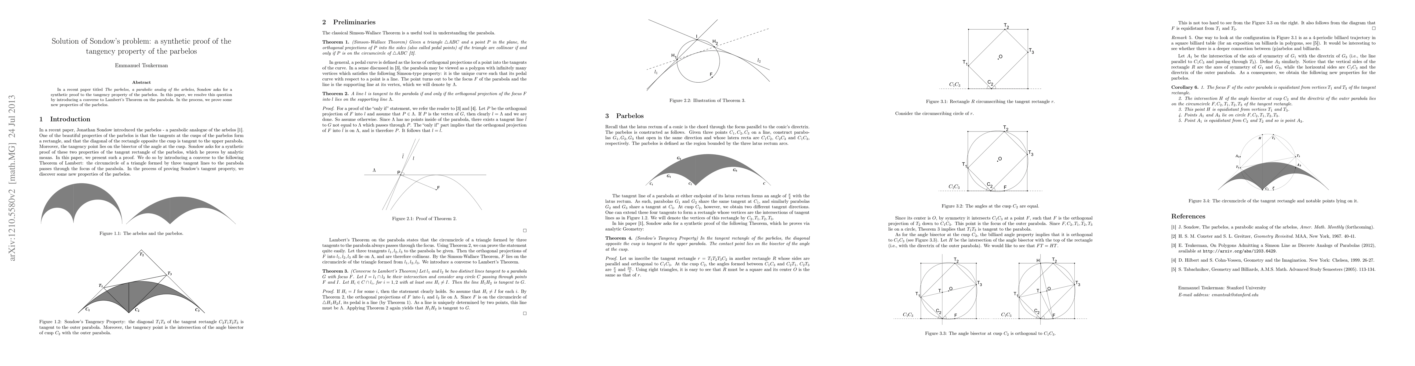 In a recent paper titled "The parbelos, a parabolic analog of the arbelos", Sondow asks for a synthetic proof to the tangency property of the parbelos. In this paper, we resolve this question by introducing a converse to Lambert's Theorem on the parabola and in the process prove some new properties of the parbelos.
