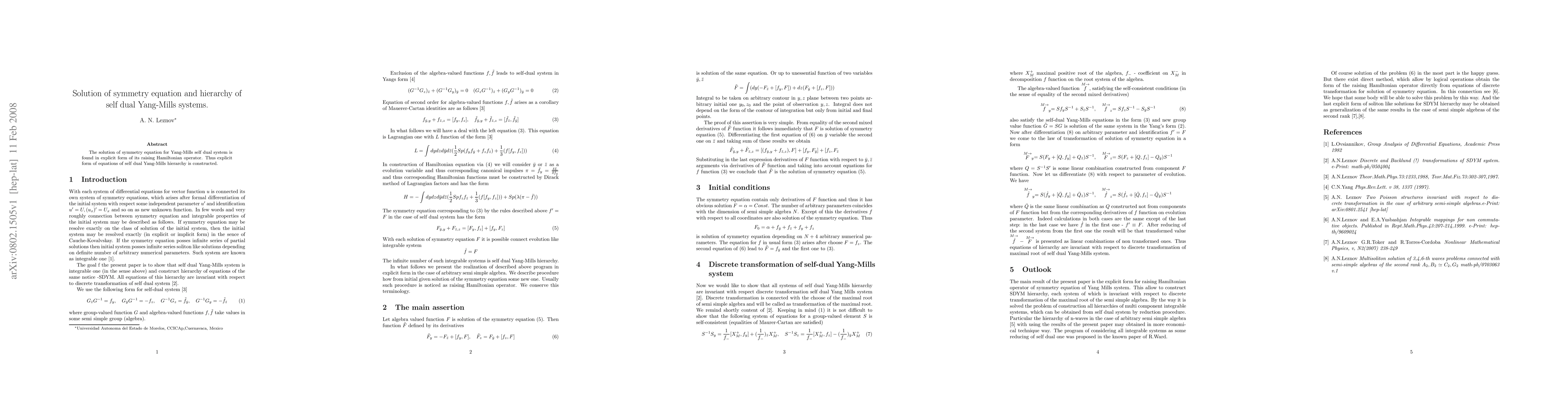 The solution of symmetry equation of Yang-Mills self dual system is found in explicit form of its raising Hamiltonian operator. Thus explicit form of equations of self dual Yang Mills hierarchy is constructed.