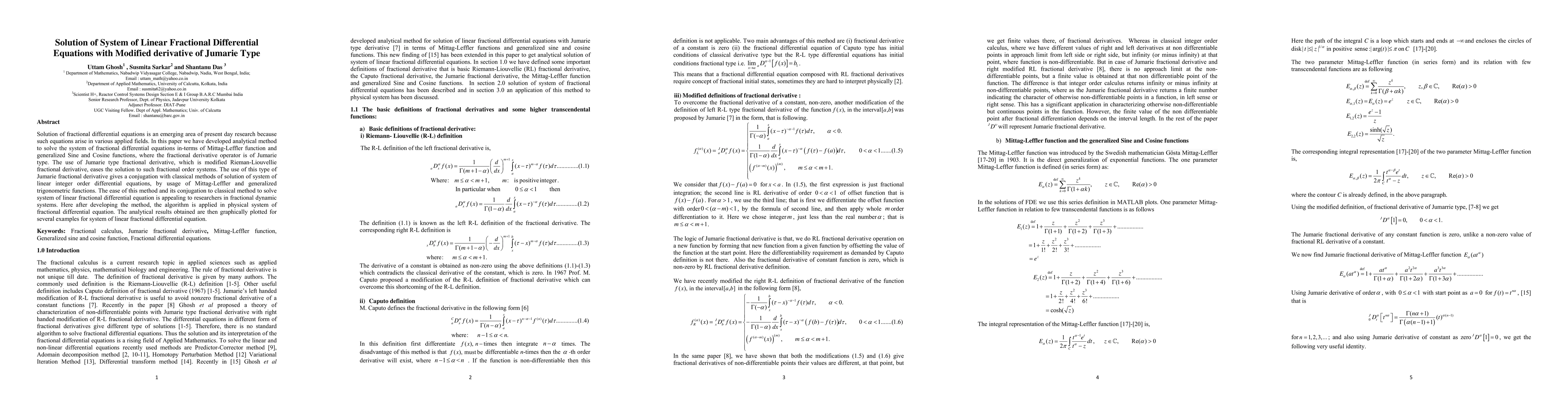 Solution of fractional differential equations is an emerging area of present day research because such equations arise in various applied fields. In this paper we have developed analytical method to solve the system of fractional differential equations in-terms of Mittag-Leffler function and generalized Sine and Cosine functions, where the fractional derivative operator is of Jumarie type. The use of Jumarie type fractional derivative, which is modified Rieman-Liouvellie fractional derivative, eases the solution to such fractional order systems. The use of this type of Jumarie fractional derivative gives a conjugation with classical methods of solution of system of linear integer order differential equations, by usage of Mittag-Leffler and generalized trigonometric functions. The ease of this method and its conjugation to classical method to solve system of linear fractional differential equation is appealing to researchers in fractional dynamic systems. Here after developing the method, the algorithm is applied in physical system of fractional differential equation. The analytical results obtained are then graphically plotted for several examples for system of linear fractional differential equation.