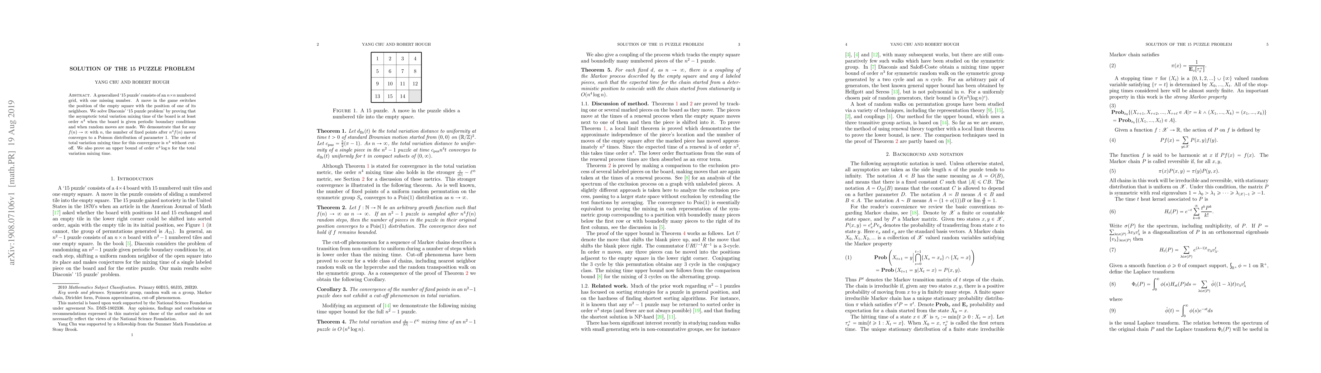 A generalized `$15$ puzzle' consists of an $n \times n$ numbered grid, with one missing number. A move in the game switches the position of the empty square with the position of one of its neighbors. We solve Diaconis' `15 puzzle problem' by proving that the asymptotic total variation mixing time of the board is at least order $ n^4 $ when the board is given periodic boundary conditions and when random moves are made. We demonstrate that for any $f(n) \to \infty$ with $n$, the number of fixed points after $n^4 f(n)$ moves converges to a Poisson distribution of parameter 1. The order of total variation mixing time for this convergence is $n^4$ without cut-off. We also prove an upper bound of order $n^{4 }\log n$ for the total variation mixing time.