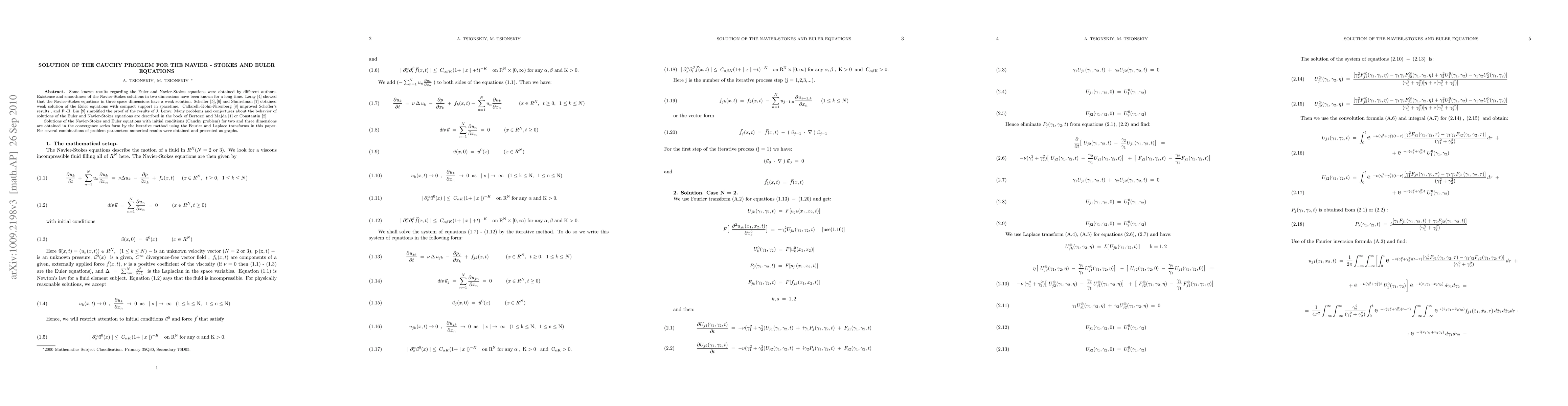 This paper presents solutions to the Cauchy problem for the Navier-Stokes and Euler equations in both two and three dimensions using iterative methods with Fourier and Laplace transforms. Numerical results for various parameter combinations are provided in graphical form.