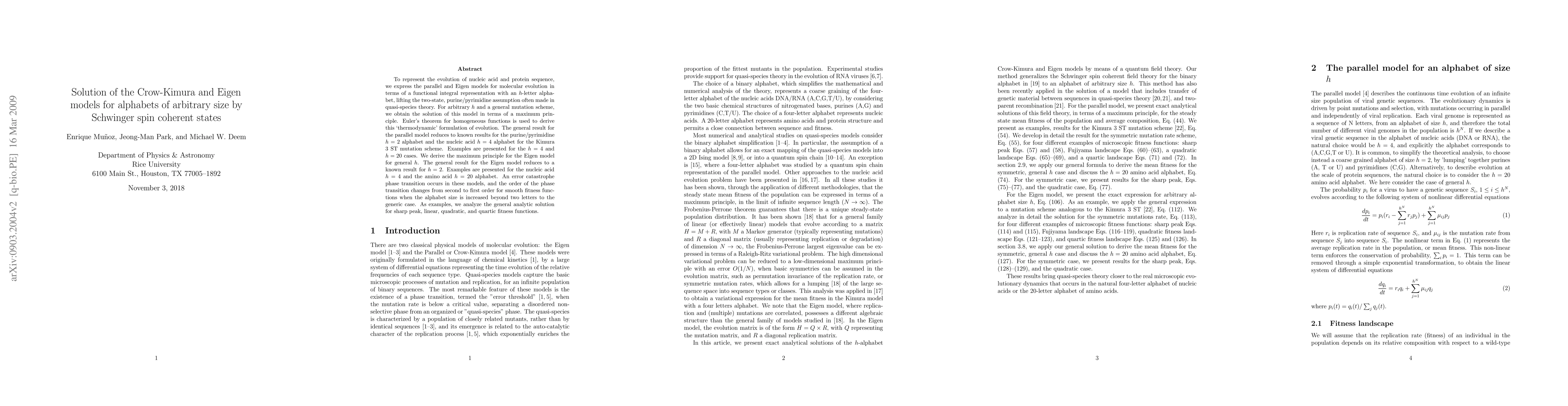 To represent the evolution of nucleic acid and protein sequence, we express the parallel and Eigen models for molecular evolution in terms of a functional integral representation with an $h$-letter alphabet, lifting the two-state, purine/pyrimidine assumption often made in quasi-species theory. For arbitrary $h$ and a general mutation scheme, we obtain the solution of this model in terms of a maximum principle. Euler's theorem for homogeneous functions is used to derive this `thermodynamic' formulation of evolution. The general result for the parallel model reduces to known results for the purine/pyrimidine $h=2$ alphabet and the nucleic acid $h=4$ alphabet for the Kimura 3 ST mutation scheme. Examples are presented for the $h=4$ and $h=20$ cases. We derive the maximum principle for the Eigen model for general $h$. The general result for the Eigen model reduces to a known result for $h=2$. Examples are presented for the nucleic acid $h=4$ and the amino acid $h=20$ alphabet. An error catastrophe phase transition occurs in these models, and the order of the phase transition changes from second to first order for smooth fitness functions when the alphabet size is increased beyond two letters to the generic case. As examples, we analyze the general analytic solution for sharp peak, linear, quadratic, and quartic fitness functions.