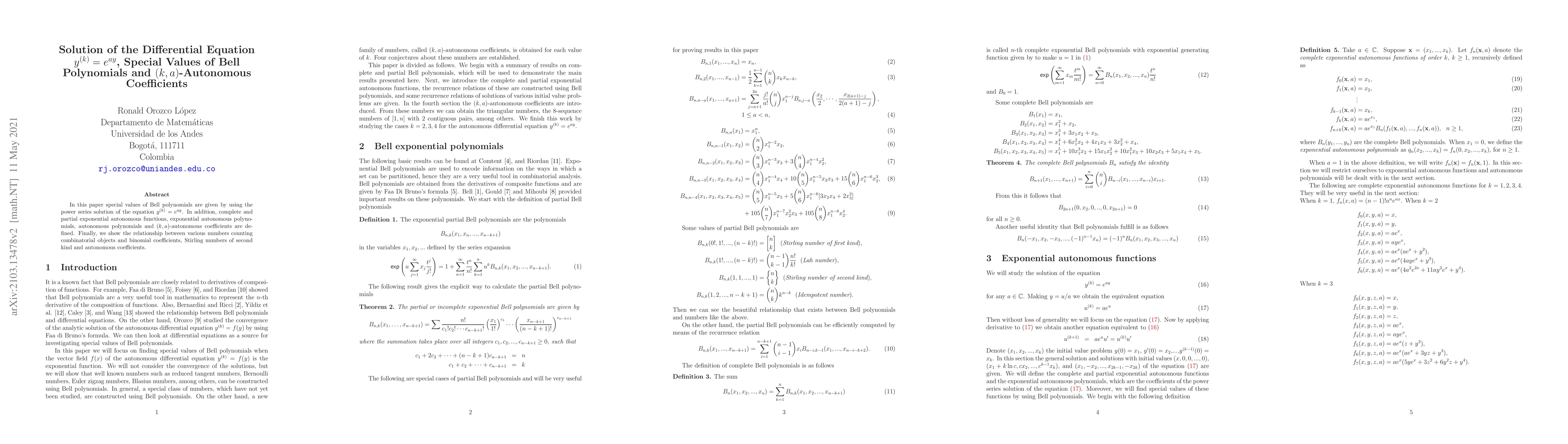 In this paper special values of Bell polynomials are given by using the power series solution of the equation $y^{(k)}=e^{ay}$. In addition, complete and partial exponential autonomous functions, exponential autonomous polynomials, autonomous polynomials and $(k,a)$-autonomous coefficients are defined. Finally, we show the relationship between various numbers counting combinatorial objects and binomial coefficients, Stirling numbers of the second kind and autonomous coefficients.