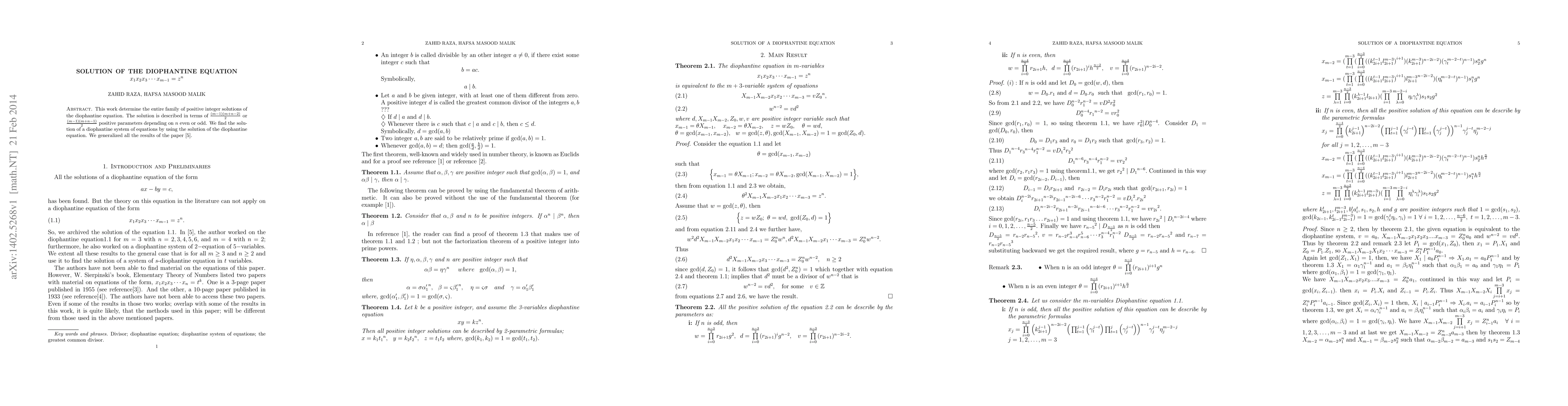 This work determine the entire family of positive integer solutions of the diophantine equation. The solution is described in terms of $\frac{(m-1)(m+n-2)}{2} $ or $\frac{(m-1)(m+n-1)}{2}$ positive parameters depending on $n$ even or odd. We find the solution of a diophantine system of equations by using the solution of the diophantine equation. We generalized all the results of the paper [5].