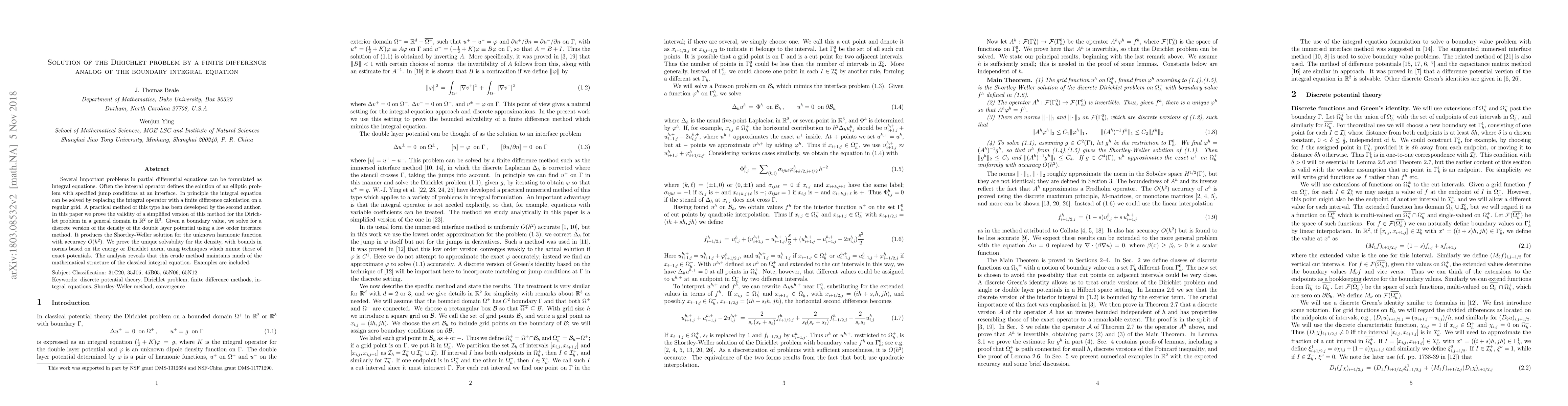 Several important problems in partial differential equations can be formulated as integral equations. Often the integral operator defines the solution of an elliptic problem with specified jump conditions at an interface. In principle the integral equation can be solved by replacing the integral operator with a finite difference calculation on a regular grid. A practical method of this type has been developed by the second author. In this paper we prove the validity of a simplified version of this method for the Dirichlet problem in a general domain in $R^2$ or $R^3$. Given a boundary value, we solve for a discrete version of the density of the double layer potential using a low order interface method. It produces the Shortley-Weller solution for the unknown harmonic function with accuracy $O(h^2)$. We prove the unique solvability for the density, with bounds in norms based on the energy or Dirichlet norm, using techniques which mimic those of exact potentials. The analysis reveals that this crude method maintains much of the mathematical structure of the classical integral equation. Examples are included.
